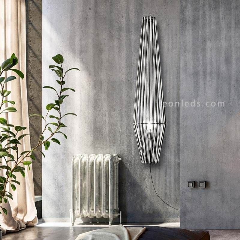 Ihr Design umfasst eine Metallstruktur in mattschwarz mit länglicher Form und ist mit einem oder zwei Farben wählbaren Schnüren verflochten. Sie verfügt über 1 einstellbares hängendes Kabel und eine mattschwarze Blende zur Installation an der Decke, sodass die Lampe schwebend wirkt. Sie ist ideal, um in Wohnzimmern und Esszimmern als Umgebungslicht eingesetzt zu werden. Wenn du einen originelleren Akzent setzen möchtest, kannst du sie auf beiden Seiten des Bettes als Nachttischlampen platzieren und einen einzigartigen Effekt erzeugen.