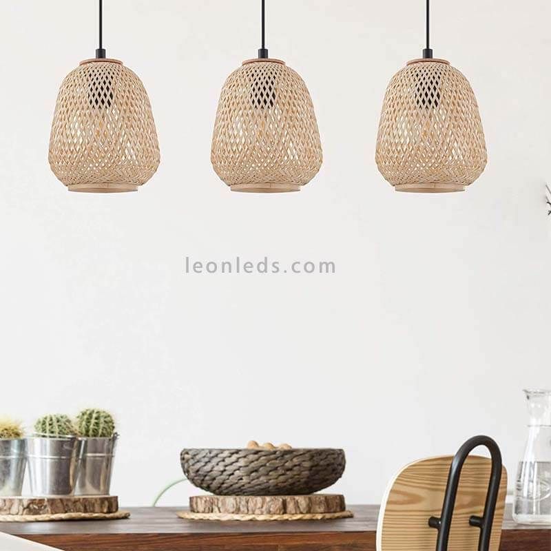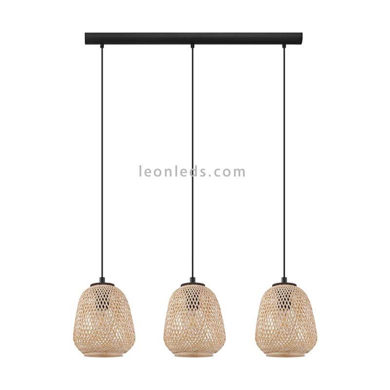 Die hängende Lampe Dembleby Natur 3 Flammen aus Holz von Eglo Iluminación ist einer der neuesten Trends in der Beleuchtung, da sie verschiedene Materialien wie Holz und Metall kombiniert und ein modernes und natürliches Ergebnis bietet.