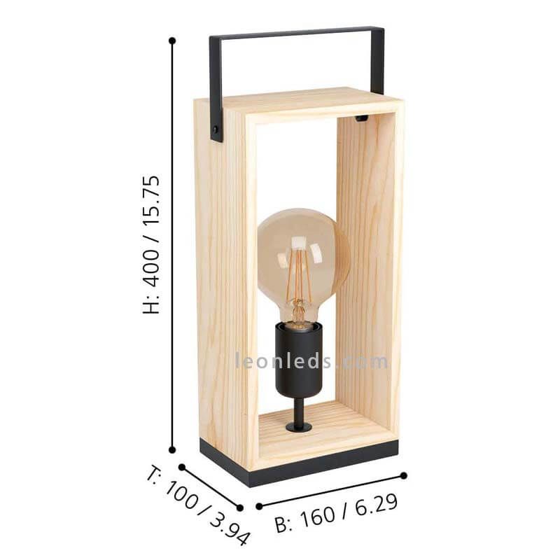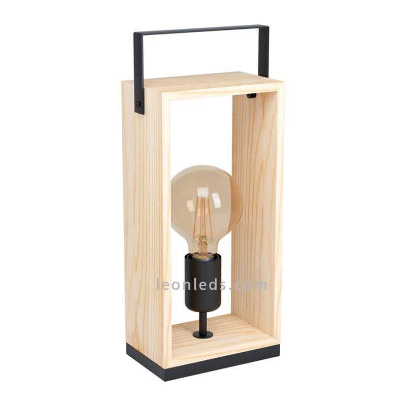 Die Vintage Tischlampe Famborough mit 1 Licht von Eglo Beleuchtung. Sie ist aus einer hohlen Holzstruktur mit rechteckiger Form gefertigt, die den Lampensockel umhüllt, zusammen mit einem schwarzen Stahlgriff.