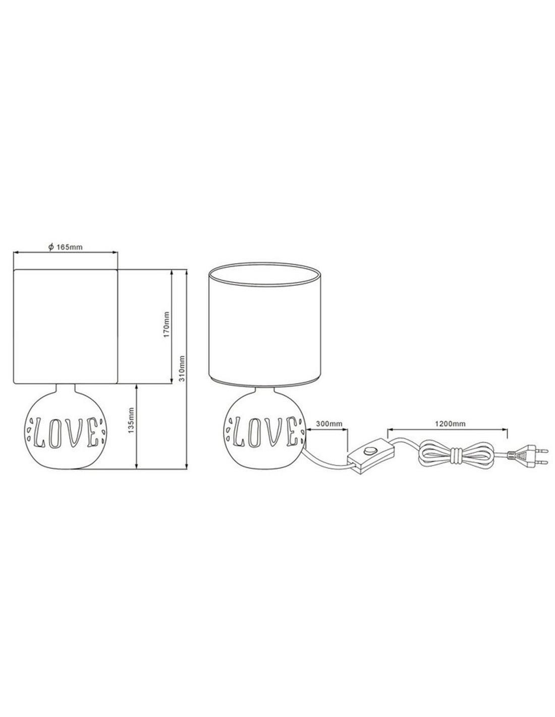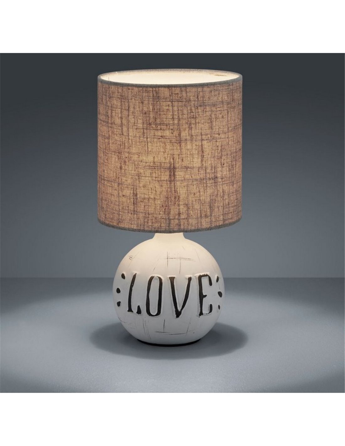 Die Tischlampe ESNA ist ein dekoratives und funktionales Stück, das Wärme und Charme in jeden Raum bringt. Ihr Design kombiniert eine weiße Keramikbasis mit erhabenem Schriftzug LOVE und einen grauen Textilschirm, wodurch ein rustikaler und moderner Stil erreicht wird. Dank ihrer kompakten Größe ist sie perfekt als Zusatzlicht in Wohnzimmern, Nachttischen oder dekorativen Regalen geeignet.