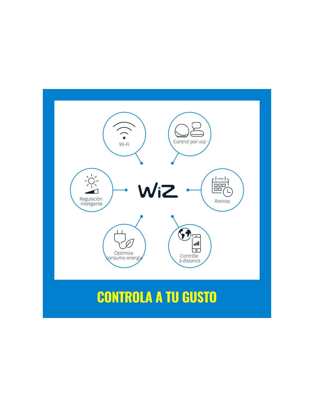 WiZ ermöglicht es Ihnen, die intelligente Beleuchtung auf verschiedene Arten zu steuern. Passen Sie die Lichter mit Ihrem Smartphone, per Sprachbefehl, mit der WiZ-Fernbedienung oder durch Nutzung des Wandschalters an, um zwischen zwei Lieblingsmodi zu wechseln. Dies ist eine praktische drahtlose Lampe mit integriertem wiederaufladbarem Akku, die ein Touchpanel hat, so dass die Nutzung sehr intuitiv wird. Schließlich hat dieses Gerät eine IP20-Zertifizierung gegen feste Gegenstände größer als 12 mm und eine Lebensdauer von bis zu 25.000 Stunden.