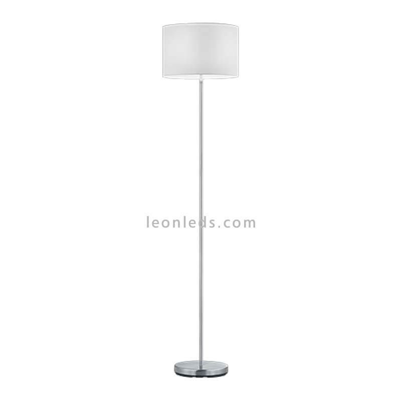 Stehlampe mit einem weißen textilen Schirm und einem metallischen Rahmen in Chromfarbe aus der Hotelkollektion von Trio Lighting, die Maße können Sie in einem der Bilder sehen.