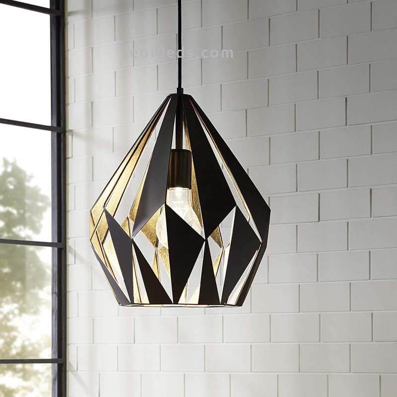 Hängelampe in Schwarz mit goldenen Akzenten aus Stahl aus der Kollektion Carlton 1 des Herstellers Eglo Beleuchtung. Eine sehr elegante Lampe mit Vintage-Finish, die die Dekoration und Beleuchtung Ihres Hauses erneuern wird. Sie verfügt über einen Schirm aus unregelmäßigen Dreiecken, der eine Glühbirne mit E27-Fassung (nicht enthalten) sichtbar macht. Wir empfehlen die Verwendung einer LED-Glühlampe im Globo-Format, um ihren Vintage- und Retro-Stil zu betonen, vorzugsweise in einem warmen Ton wie 3.000k, der den gewünschten Vintage- oder Industrieeffekt verstärkt. Die empfohlene Leistung sollte zwischen 10 und 17W liegen, je nach den Abmessungen des Raumes, den wir beleuchten möchten.