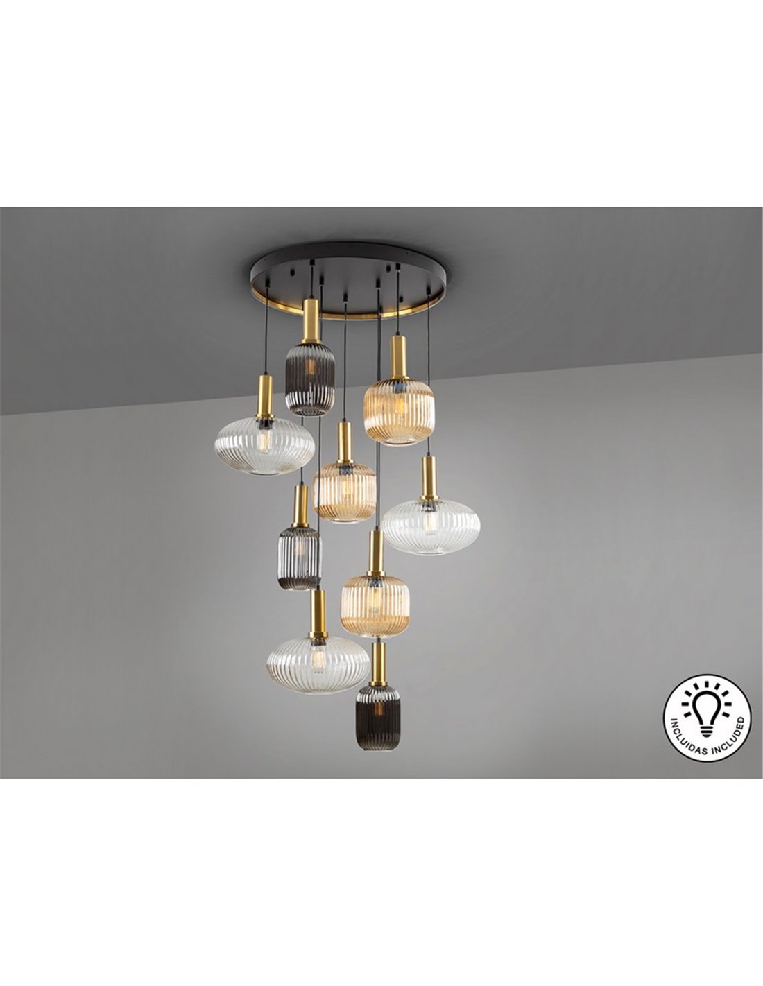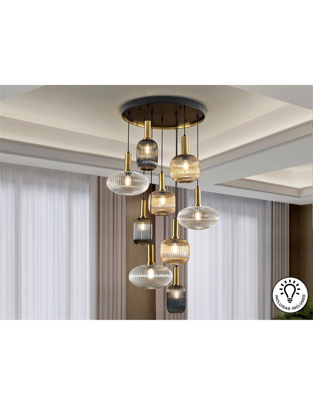 Dank ihres Durchmessers von 80 cm und der stilisierten vertikalen Struktur ist die NORMA 9 Lichter die perfekte Wahl für große Wohnzimmer, Doppelhöhen-Eingangsbereiche oder Esszimmer, wo ein beeindruckendes Stück den Unterschied macht. Die Mischung aus Gläsern in drei Farbtönen verleiht dem Endfinish Dynamik und Persönlichkeit.