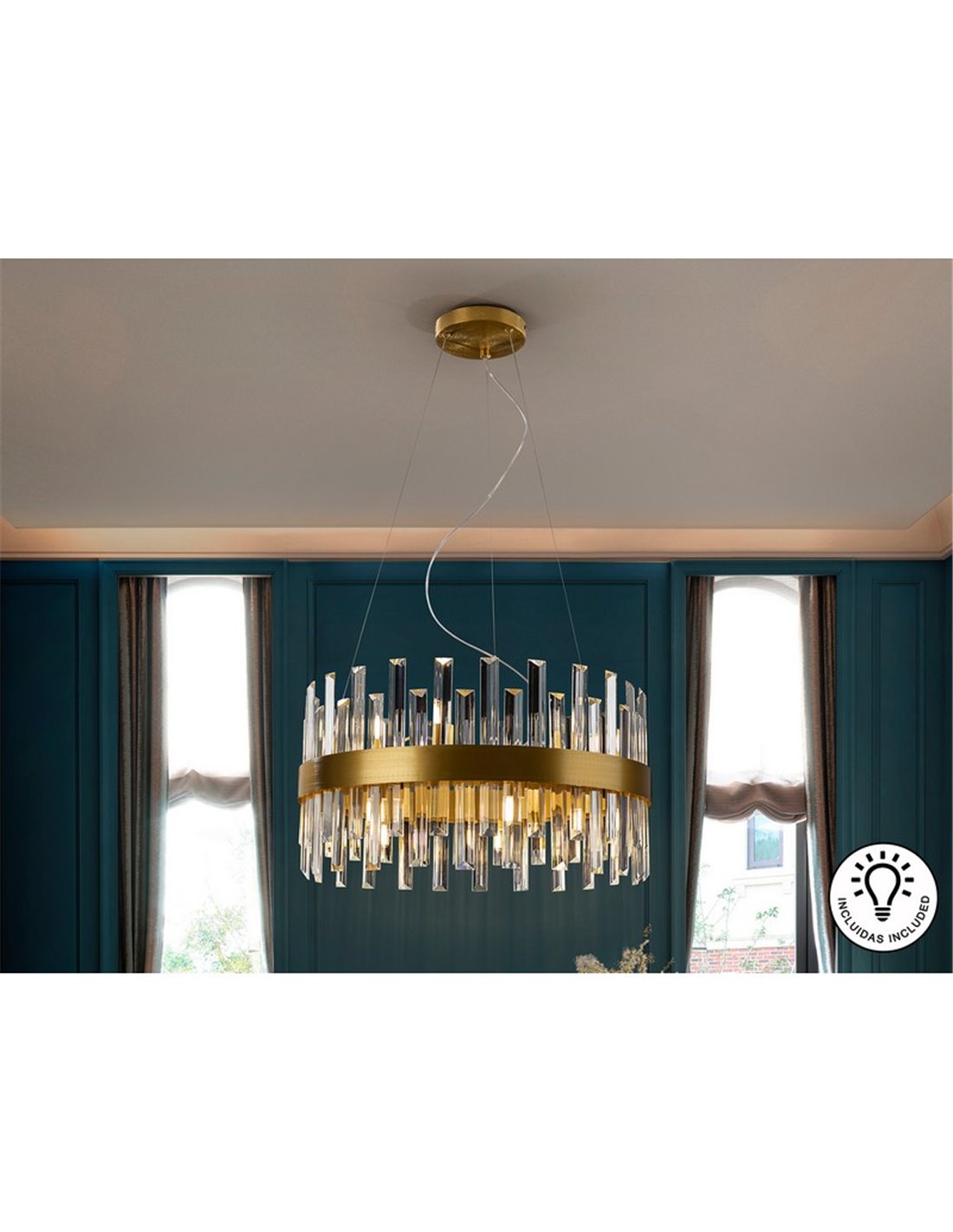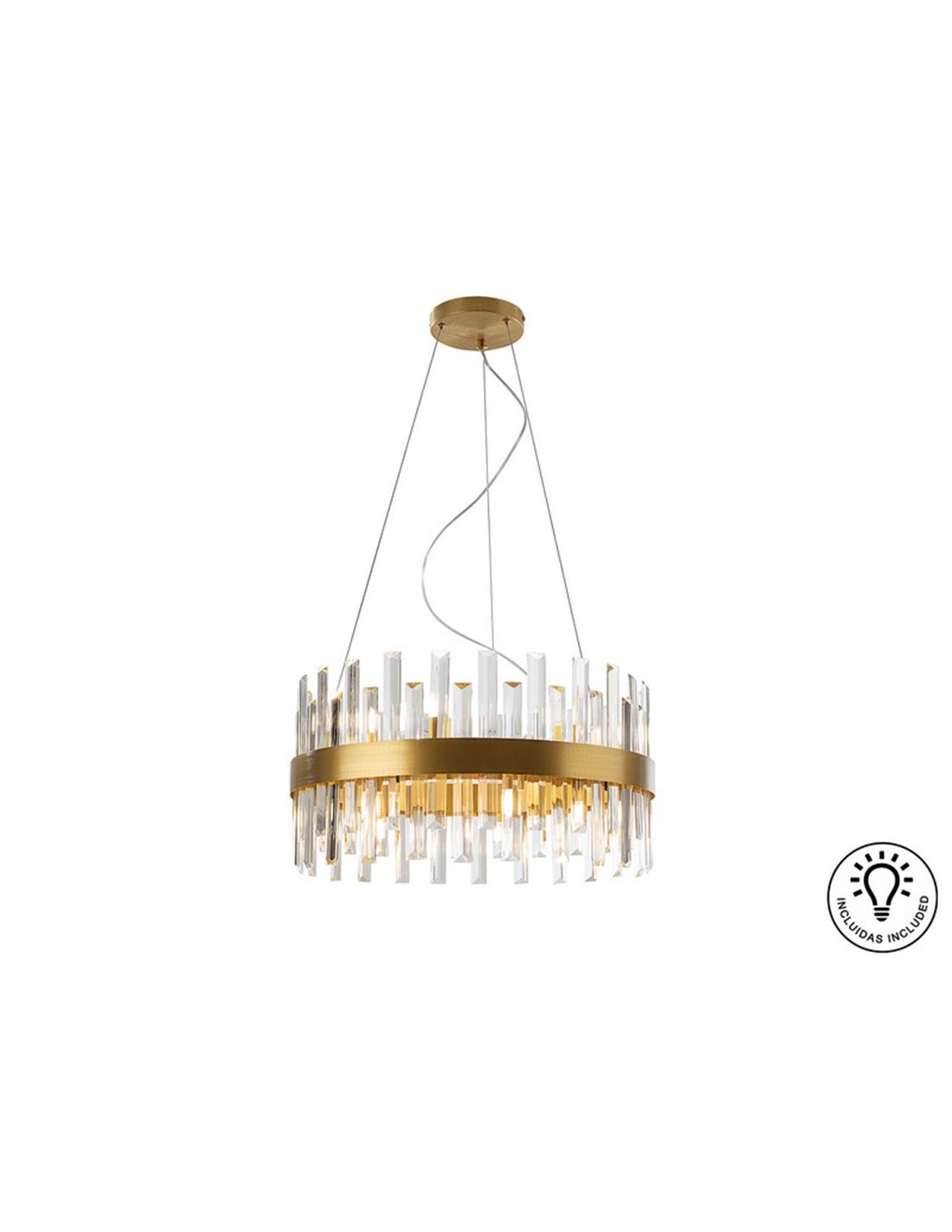- Finish: gebürstetes Gold und klares Glas.