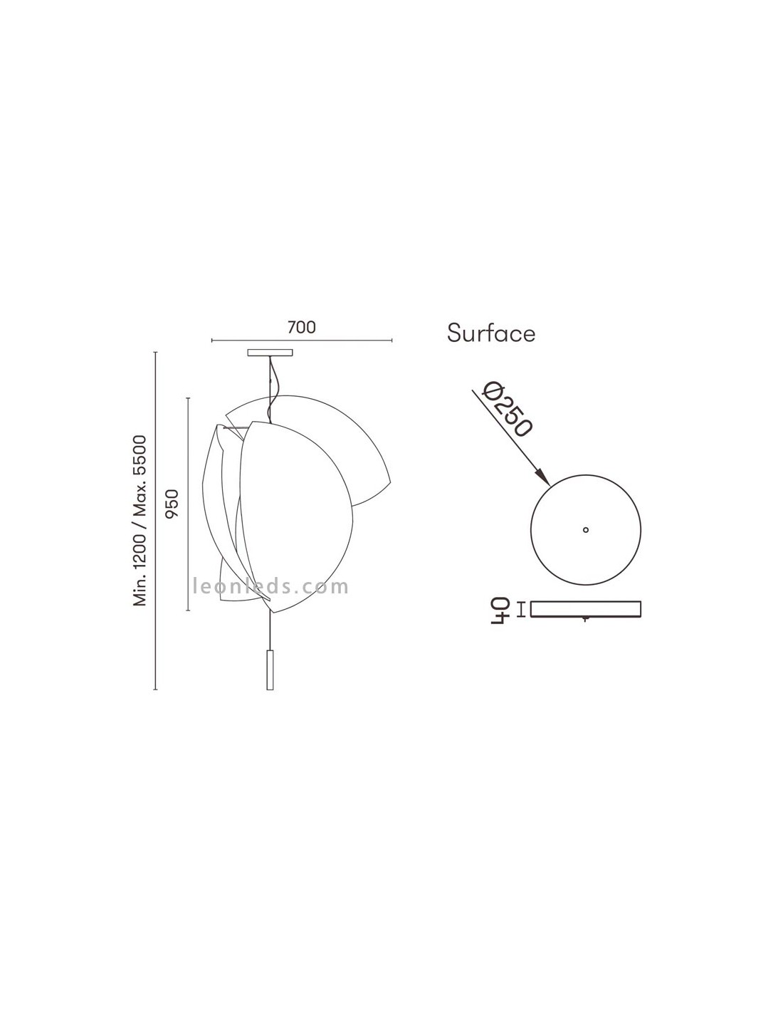 Diese Lampe kann in der Höhe von 120Cm bis 550Cm reguliert werden. Ihre Schirmhöhe beträgt 95Cm und ihre Breite 70Cm (siehe Fotos). Die Deckenbasis ist rund mit einem Durchmesser von 25Cm, die Installation erfolgt auf der Oberfläche und ragt 4Cm von der Decke hervor.