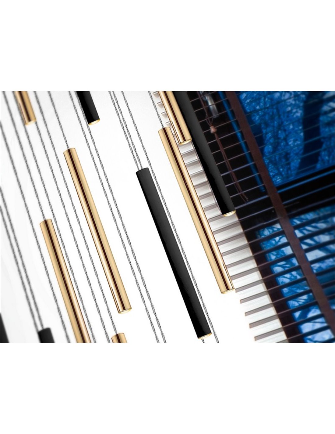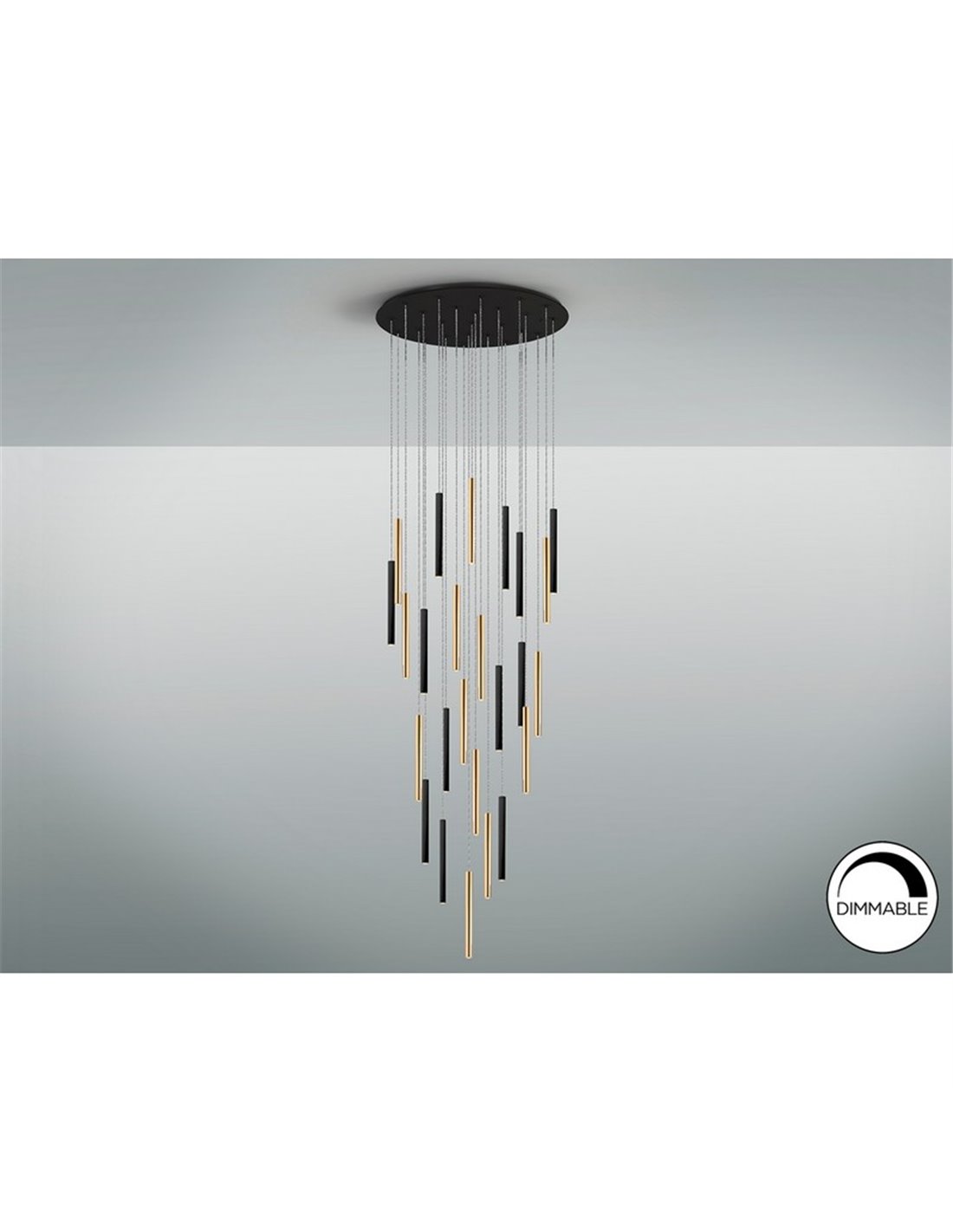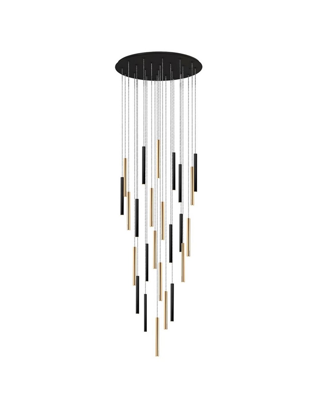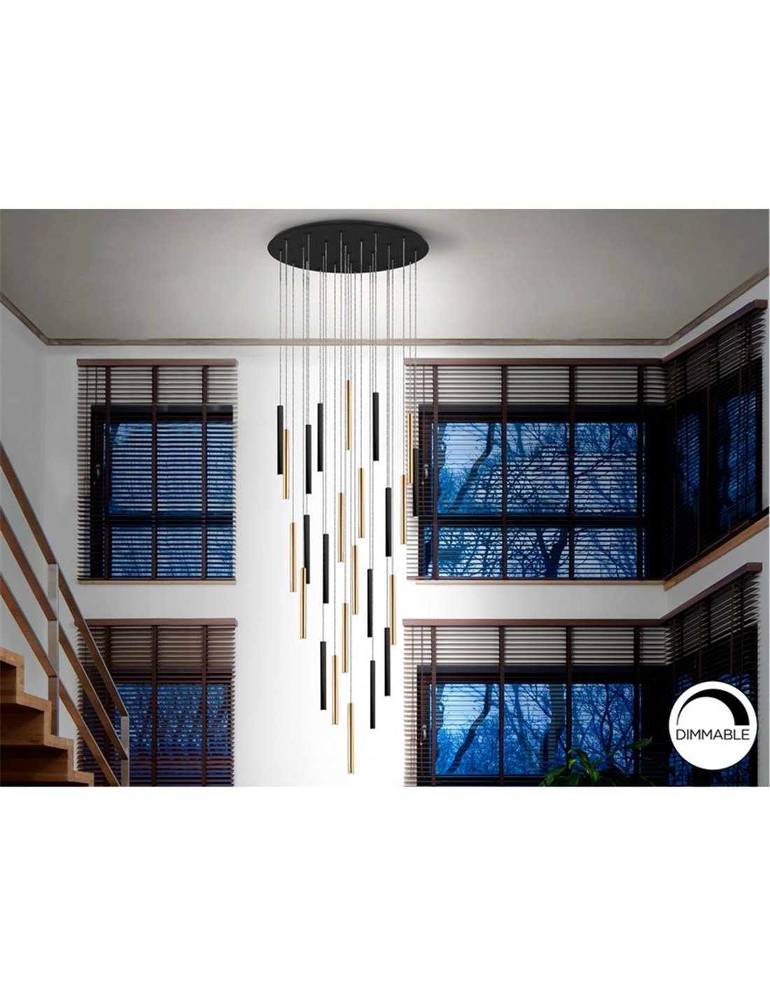 Die VARAS 25 Lichter ist eine großformatige Lampe, die dafür gedacht ist, in großen Wohnzimmern, Doppelhoch-Wartebereichen oder Geschäftsräumen hervorzuheben, da das Licht Teil des Designs ist. Ihre Struktur aus matt schwarzem Metall kombiniert mit glänzenden Golddetails bietet einen eleganten Kontrast, während die opaligen Acryl-Diffusoren eine gleichmäßige und angenehme Beleuchtung liefern.