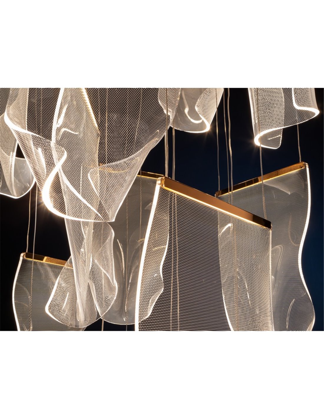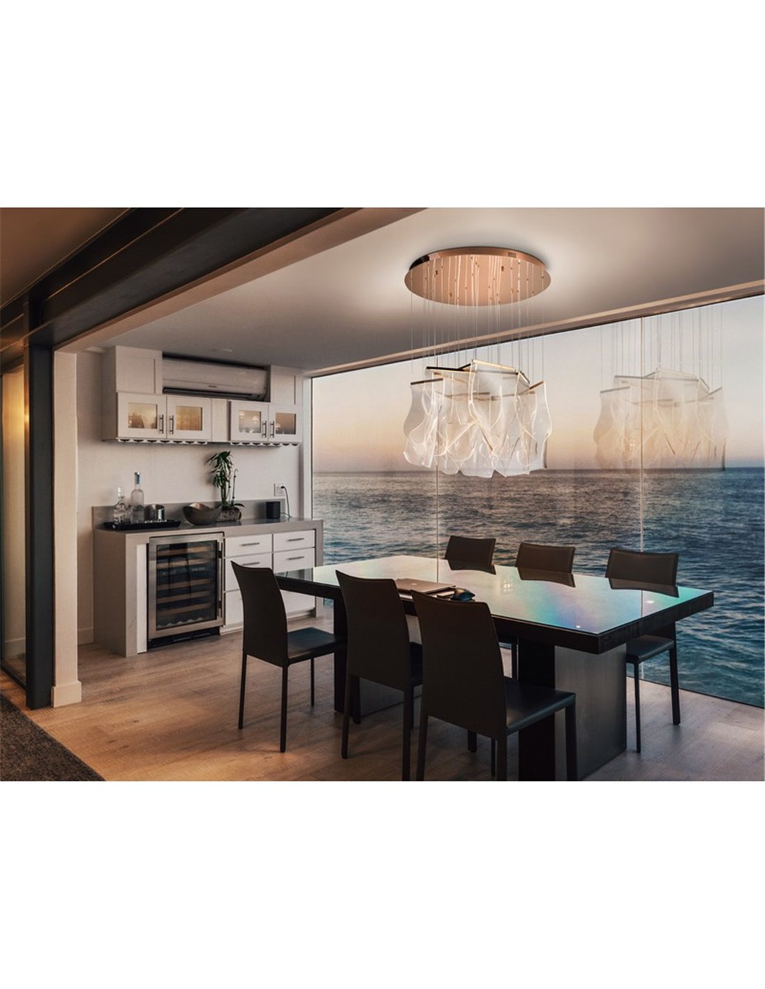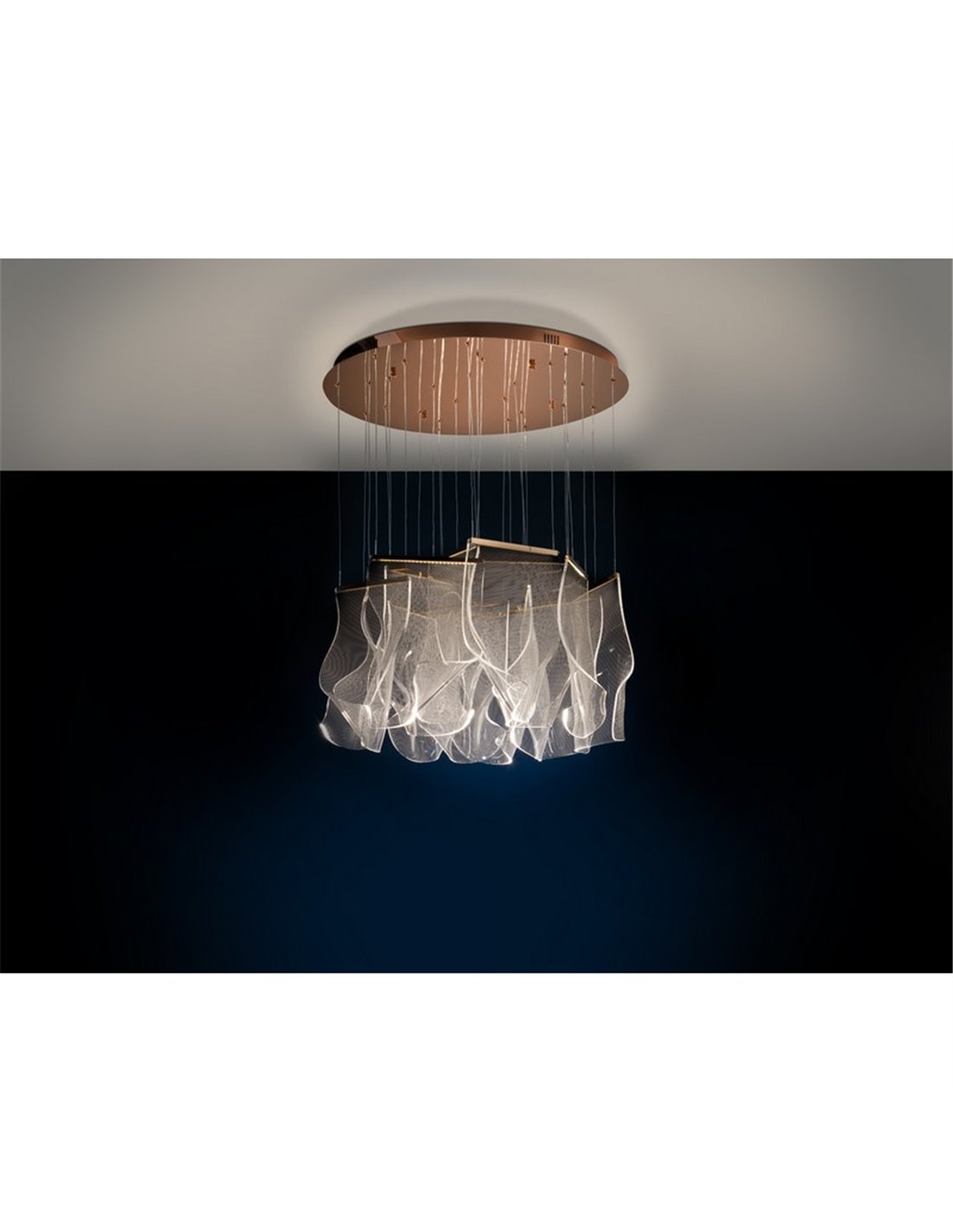 Die VELOS 14 Lichter besticht durch ihr raffiniertes Design und ihre einhüllende Beleuchtung, die Metall in Roségold mit microgeprägten Methacrylatschirmen kombiniert, die das Licht sanft streuen und einen dekorativen visuellen Effekt erzeugen. Es ist eine ideale Option für große Wohnzimmer, Esszimmer und moderne Räume, die sowohl einen markanten als auch kraftvollen Akzent setzen möchten.