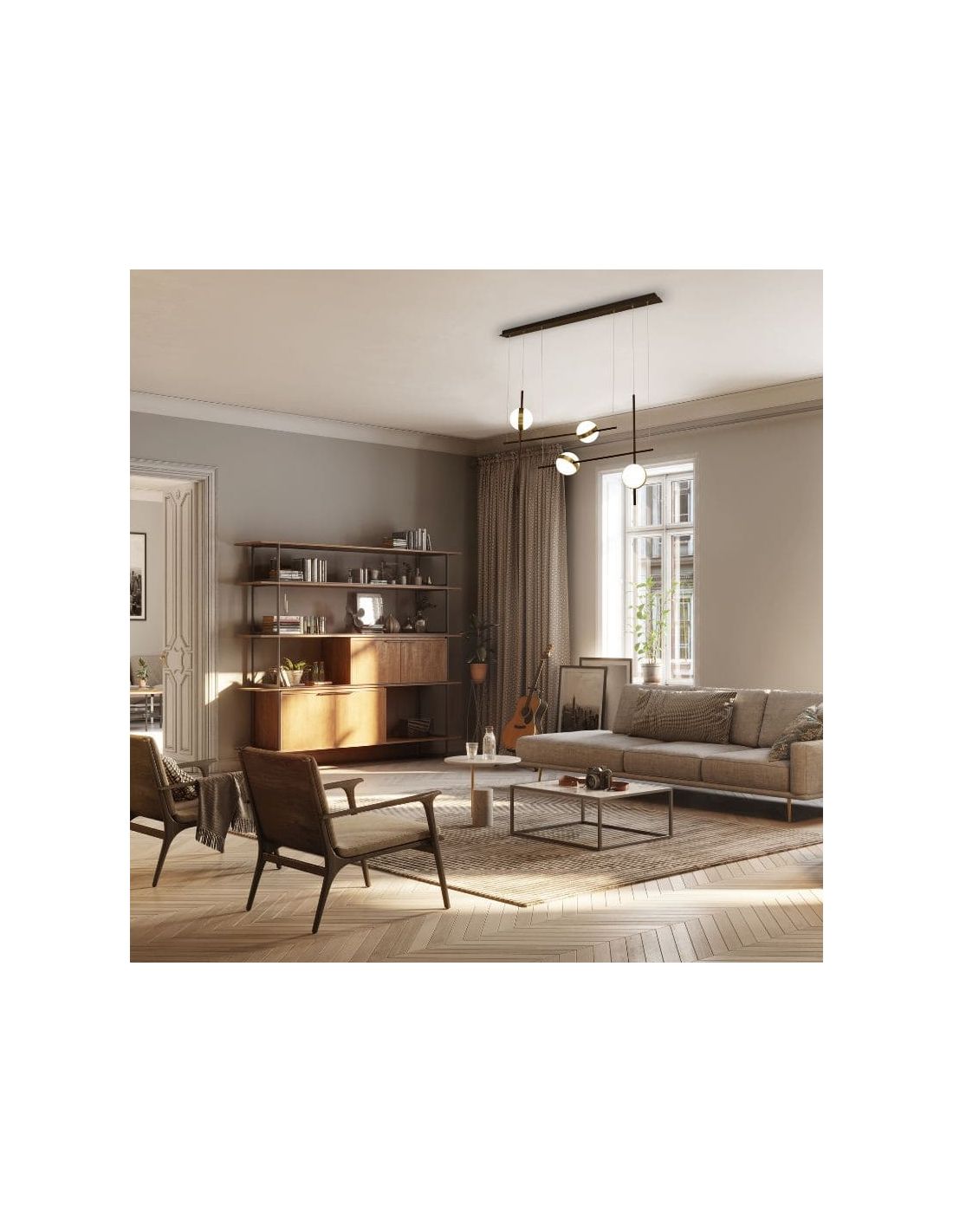 Dank ihrer horizontalen Struktur von 88 cm und einstellbaren Kabeln bis zu 140 cm Höhe eignet sich diese Hängelampe perfekt zur Installation über Esstischen, Kücheninseln oder in modernen Wohnzimmern. Ihr minimalistischer und eleganter Stil macht sie zu einem dekorativen Blickfang.