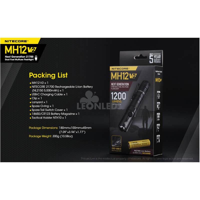 Lieferumfang: Wiederaufladbare Lampe Nitecore MH12 V2, 21700 Akku (5000 mhA), USB-C Kabel, Clip, Lanyard, Dichtung, Ersatzkappe, Schalterabdeckung, taktische Hülle NTH10.