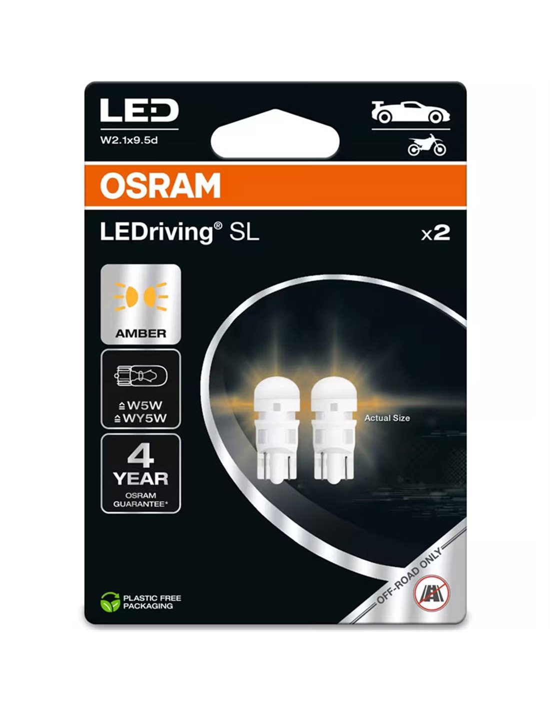 Paar von W5W Amber LEDriving SL OSRAM. Sockel W2.1x9.5d, 12V, in Amberfarbe für Blinker oder Signalisation. Effizient, langlebig und mit 4 Jahren Garantie.