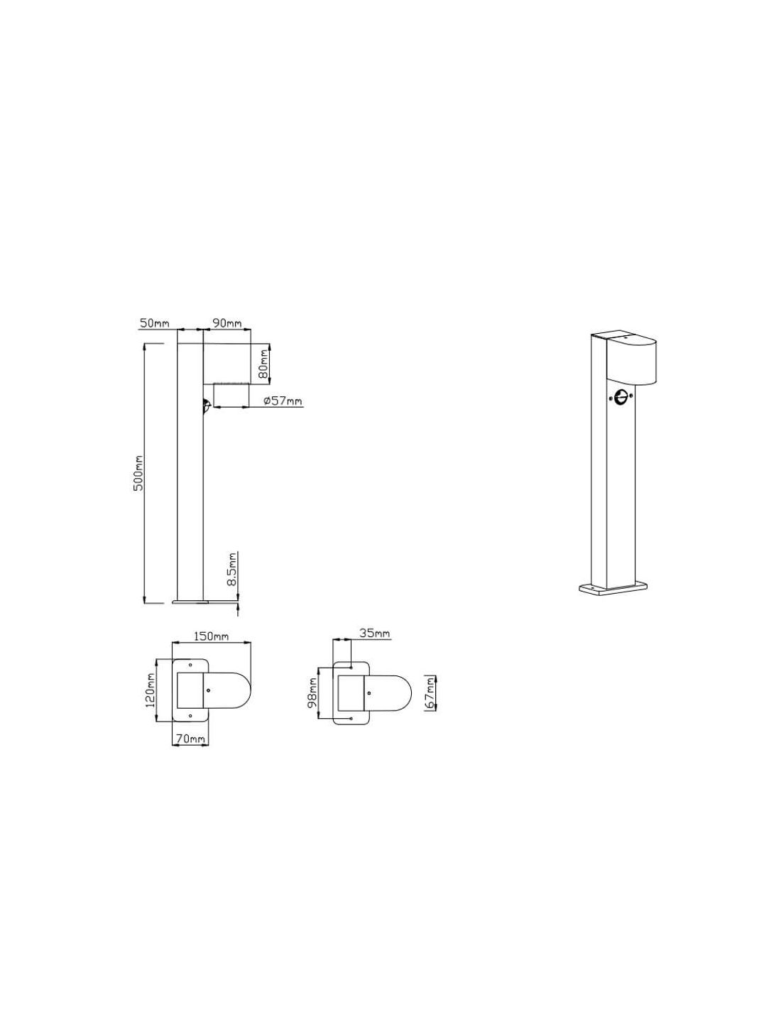 Der Roya-Pfosten mit 20W hat 12 cm Breite, 50 cm Höhe, 15 cm Durchmesser und ein Gewicht von 1,26 kg.