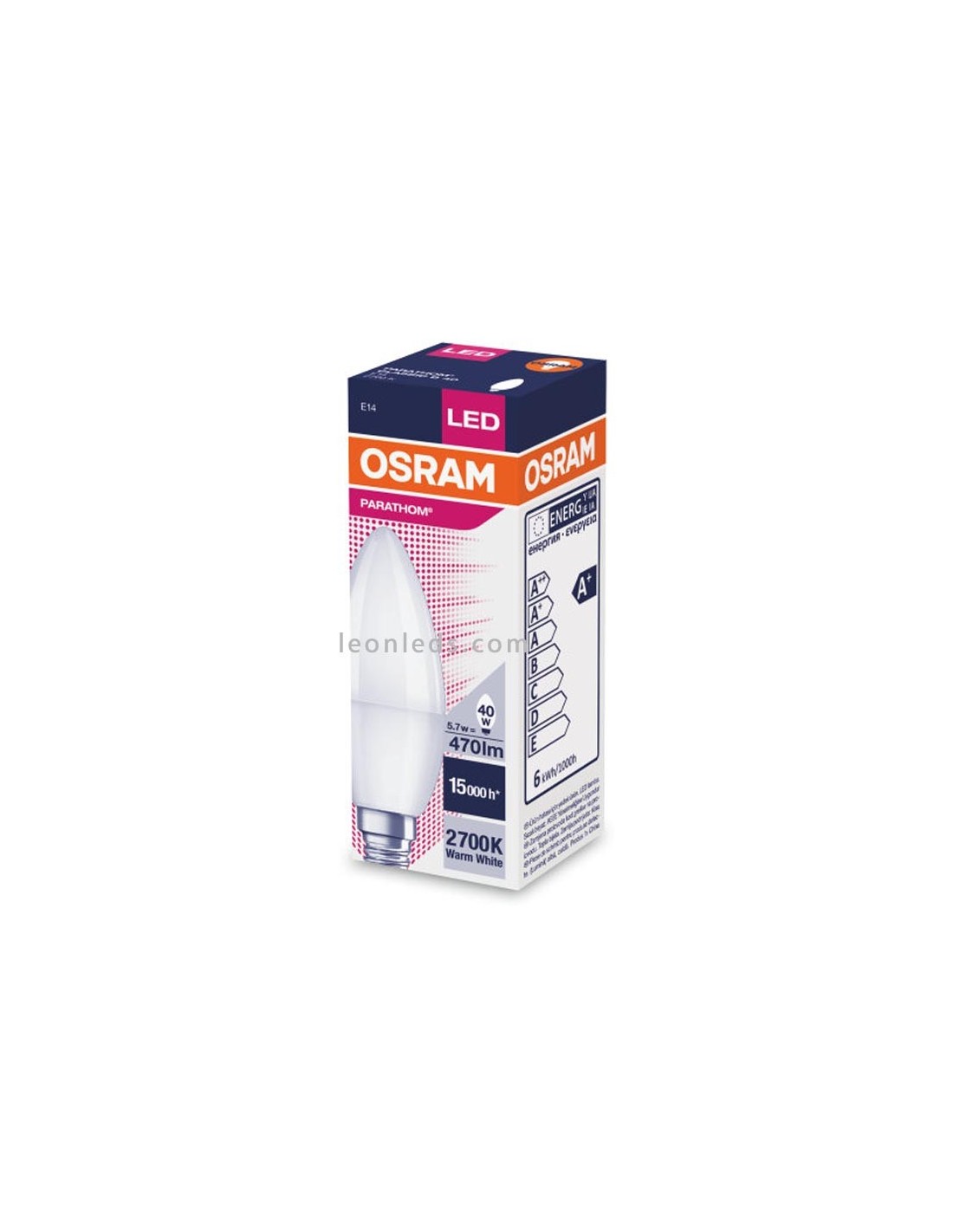 LED-Birne von der Marke Osram Parathom Classic B matt mit E14-Gewinde und Kerzenformat, mit einer Leistung von 5,5W und einer Lichtintensität von 470Lm in einem Lichtton von 2700k. Diese LED-Birne ist ideal für den Austausch von Lampen im Kerzenformat in Lampen, Wandleuchten oder Deckenleuchten, Badezimmerleuchten, Dunstabzugshauben, Deckenleuchten, Tischlampen oder jeder Lampe, die Birnen im Kerzenformat verwendet.
