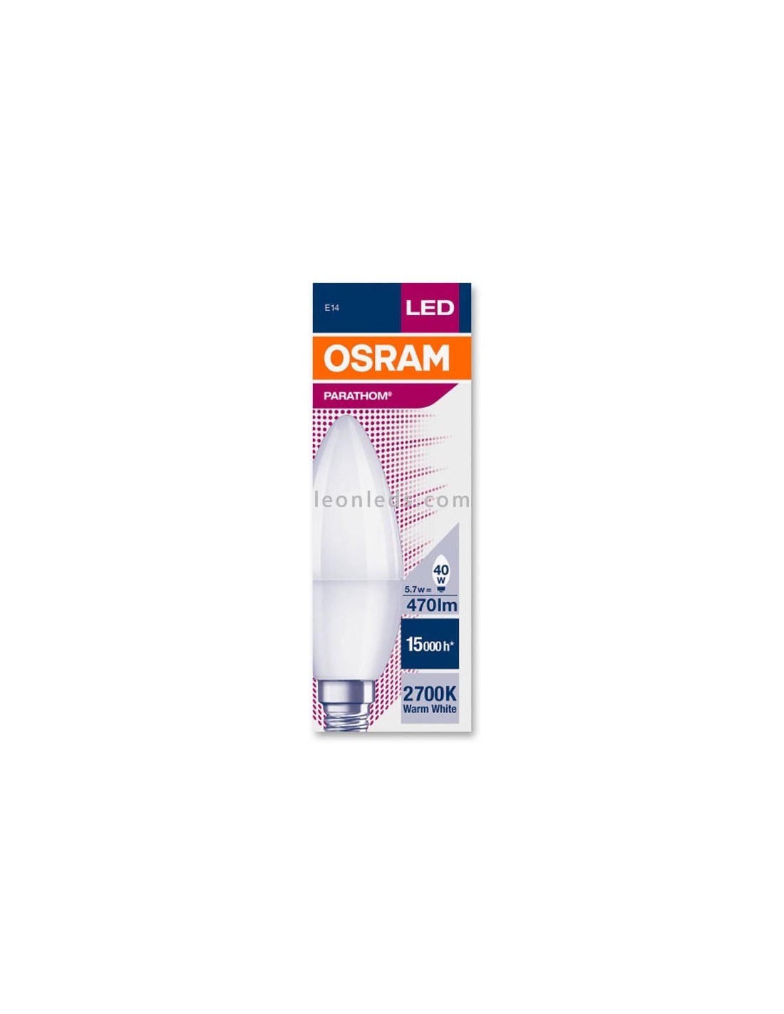 LED-Birne Osram Parathom Classic B35 matt mit E14-Gewinde, eine Leistung von 4,9W, eine Lichtintensität von 470Lm, ein warmer Lichtton von 2700k.