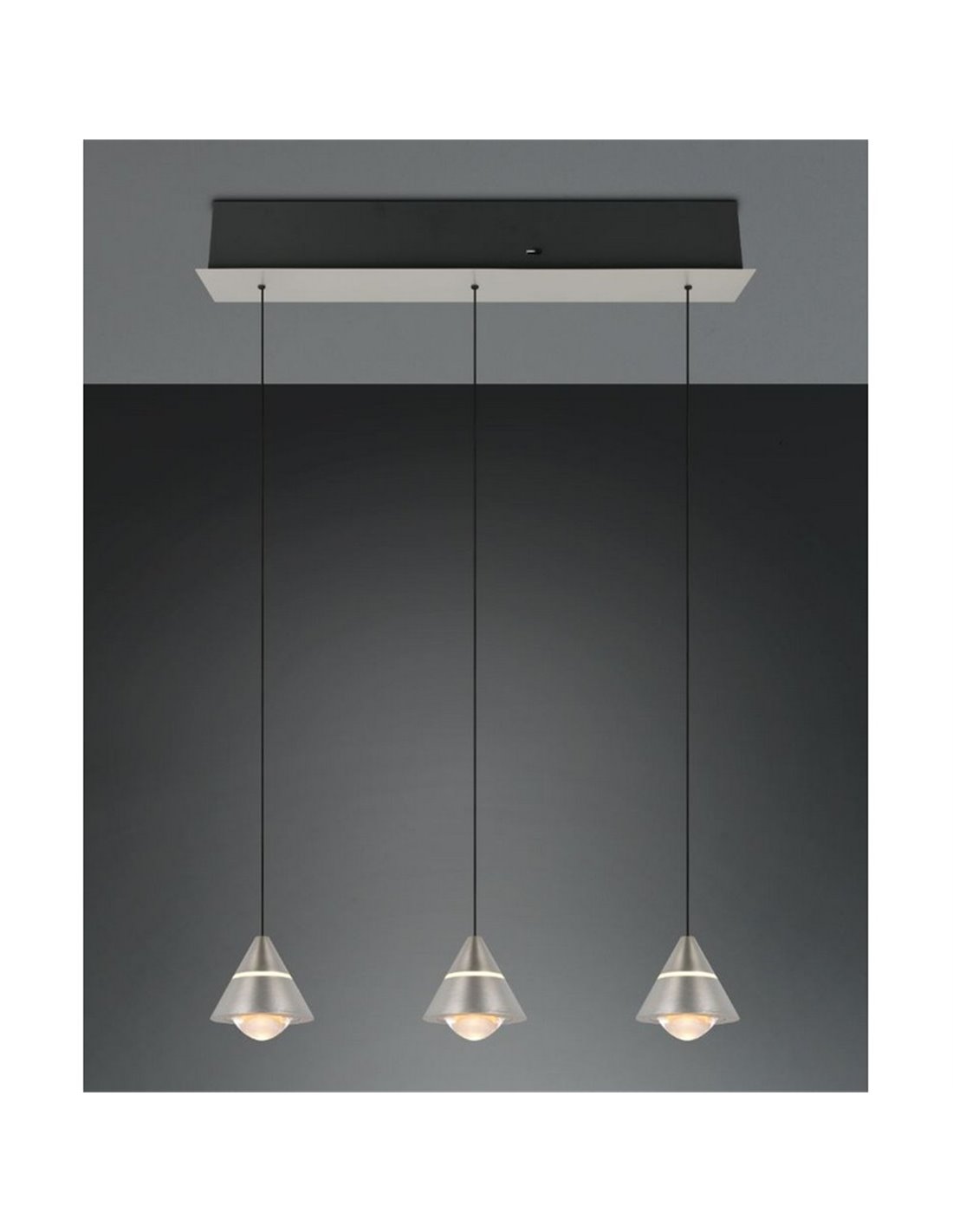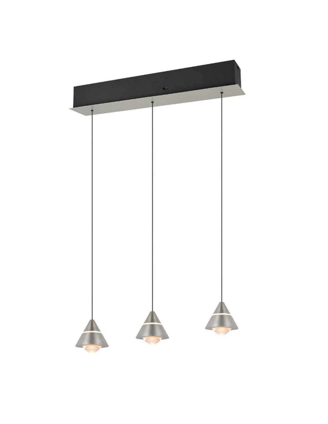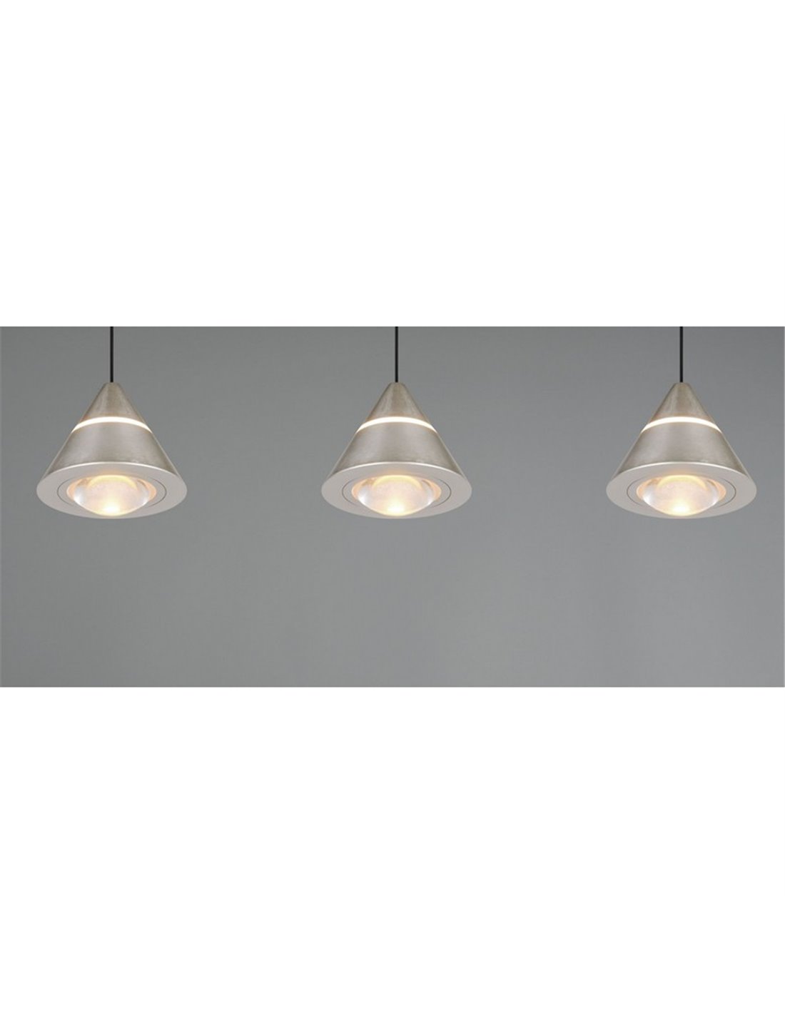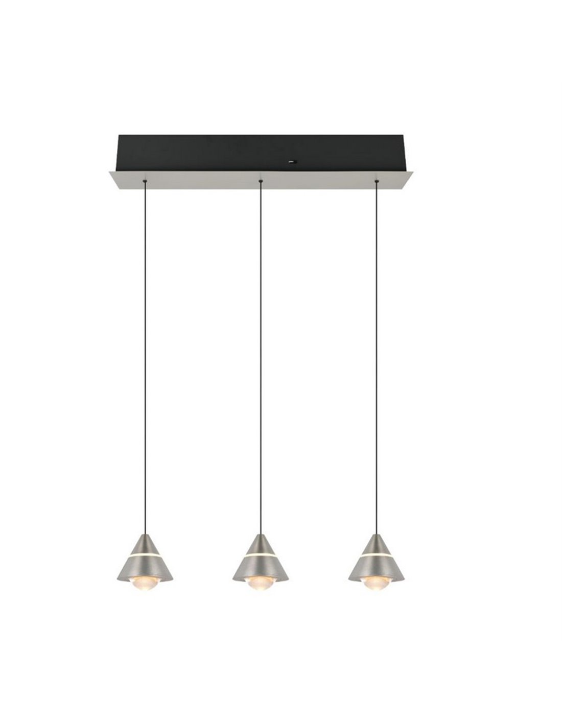 LED-Deckenleuchte ROMEO mit 3 Leuchten in mattem Nickel-Finish. Leistung von 21W, 2100lm und höhenverstellbar. Ermöglicht die Auswahl der Farbtemperatur zwischen 2300K, 3000K und 4000K mittels DIP Switch. Schutzart IP20.