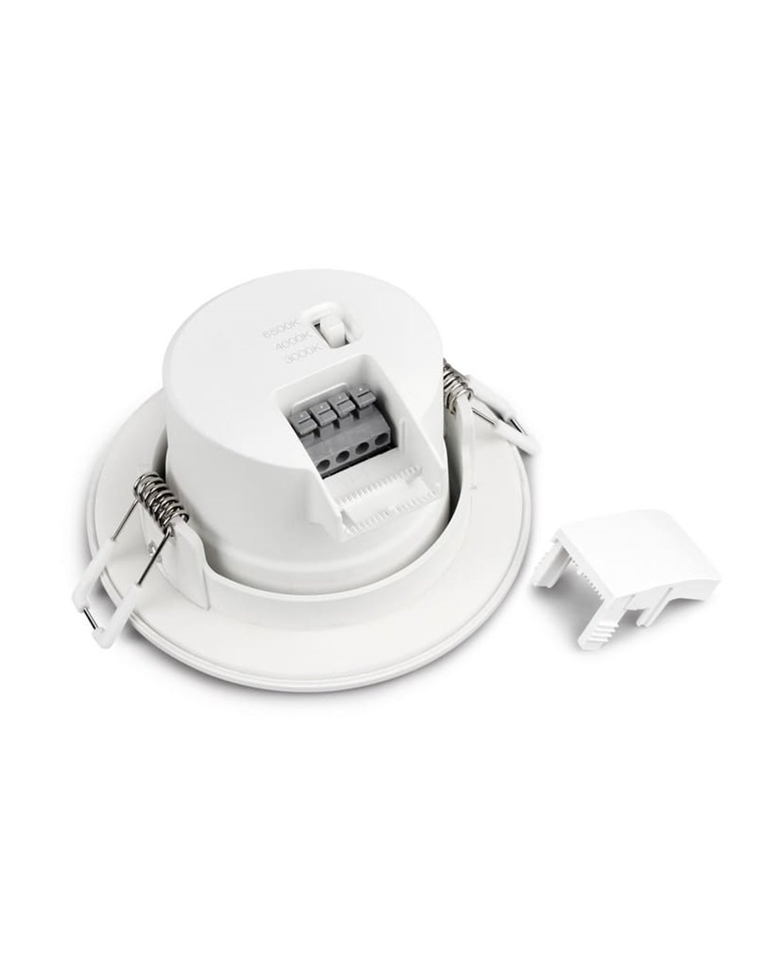 LED Downlight YUCATAN CCT mit Bewegungssensor, geeignet für Innen- und/oder Außeninstallationen in Weiß, mit verstellbaren Farbtemperaturoptionen: 2700K, 3000K und 4000K. Verfügt über einen PIR-Sensor und hat eine Leistung von 8W.