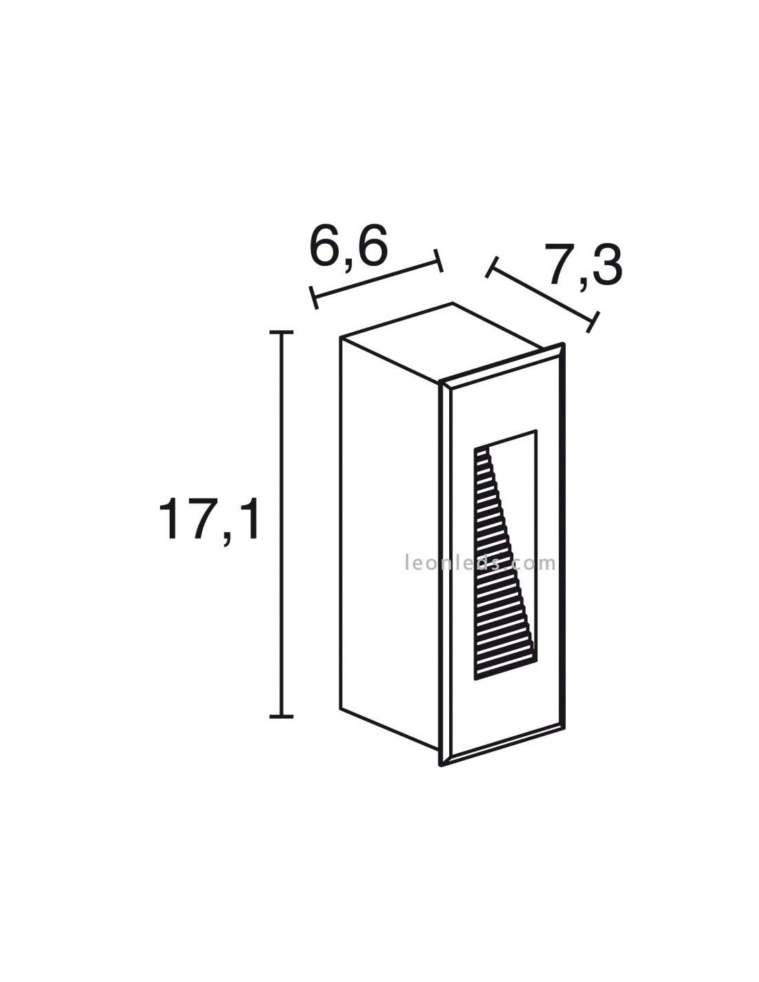 Diese Leuchte ist rechteckig und hat einen Ausschnitt von 6,6 X 17,9Cm. Ihre Höhe beträgt 17,1Cm, ihre Breite 6,6Cm und ihre Tiefe 7,3Cm.