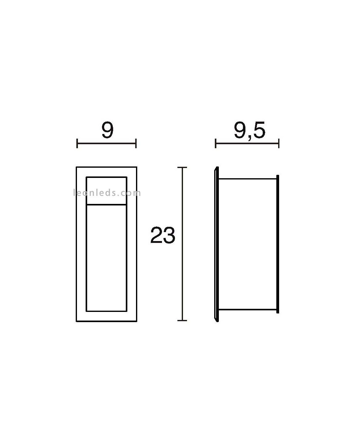 Diese Leuchte ist rechteckig und hat einen Ausschnitt von 9,5 X 23,5Cm. Ihre Höhe beträgt 23Cm, ihre Breite 9Cm und ihre Tiefe 9,5Cm.
