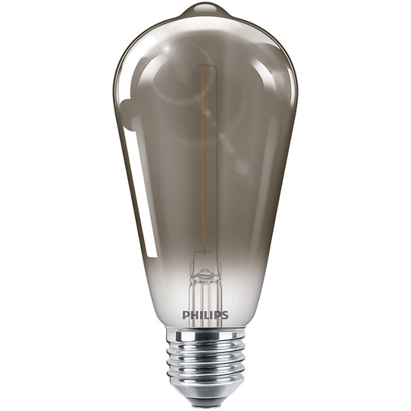 LED-Glühbirne Spiegel ST64 mit breiter E27-Fassung und Spiegeleffekt von Philips, Modell Modern LED Smoky mit einer Leistung von 2,3W - 11W und einem warmen Lichtton von 1.800K, ihre Lichtleistung beträgt 100Lm und ihre Energieeffizienz ist A+.