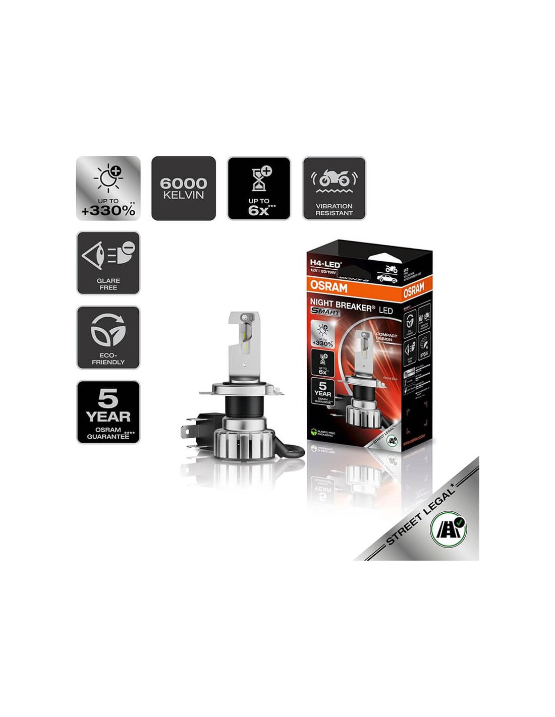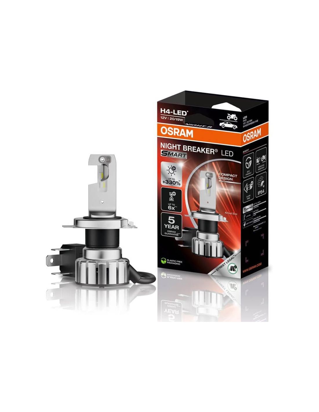 Entdecken Sie die neue H4 NIGHT BREAKER LED SMART von OSRAM, die Innovation in LED-Technologie für Fahrzeuge. Bietet bis zu 330% mehr Helligkeit, eine Lebensdauer von bis zu 6-mal länger und verbraucht 60% weniger Energie im Vergleich zu Halogenlampen. Kompatibel mit einer breiten Palette von Fahrzeugen und vollständig für den öffentlichen Straßenverkehr zugelassen. Ideal für Fern- und Abblendlicht mit einer modernen weißen Farbe von bis zu 6000K.