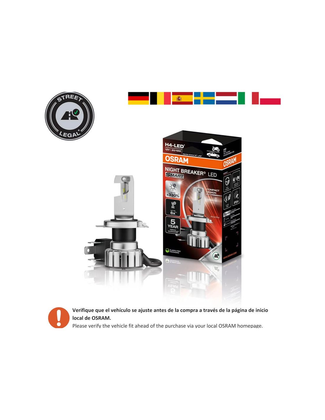 Neue LED-H4 Night Breaker Smart ZULASSUNG IN SPANIEN für Motorräder der Marke Osram mit der Referenz 64193DWNBSM-1HB, mit einer Farbtemperatur von 6000K Kaltweiß, einer Intensität von 1.650Lm/1000Lm und einer Leistung von 21W/20W, ist heller als herkömmliche Halogenlampen mit +330% Lichtintensität. Lampe für Abblend- und Fernlicht geeignet und gültig für Fassung H4. Neues Smart-Modell mit verbessertem optischen Design und mehr verfügbaren Fahrzeugmodellen für die Installation.