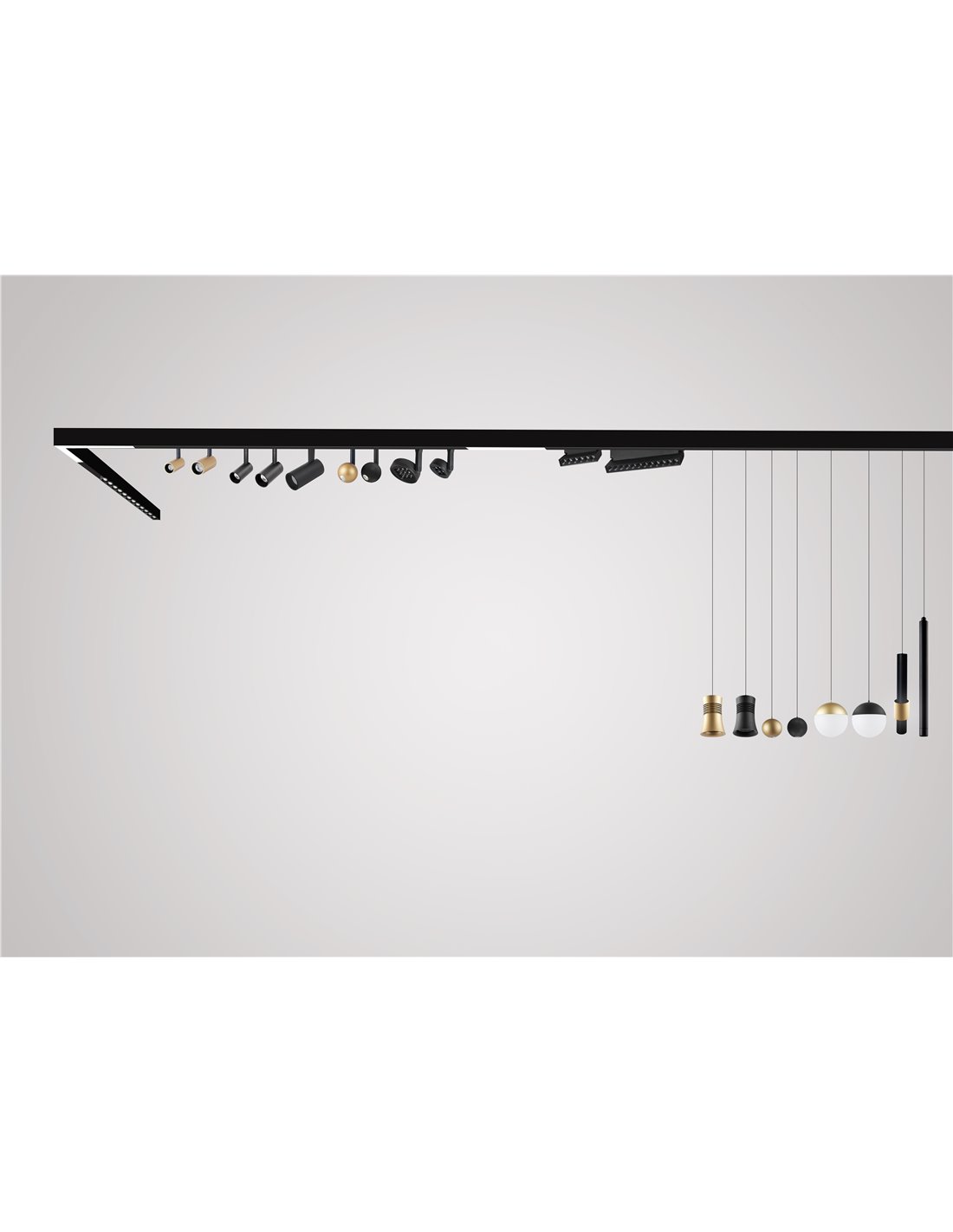Verfügbar in zwei eleganten Ausführungen: schwarz und schwarz/gold, fügt sich die MAGNETO-Leuchte perfekt in jede Umgebung ein und verleiht einen Hauch von Raffinesse und Stil. Ihr hängendes Design und die Kompatibilität mit Magnet-Schienen machen sie zu einer vielseitigen und einfach zu installierenden Option, die eine flexible Konfiguration entsprechend den Bedürfnissen des Raumes ermöglicht.