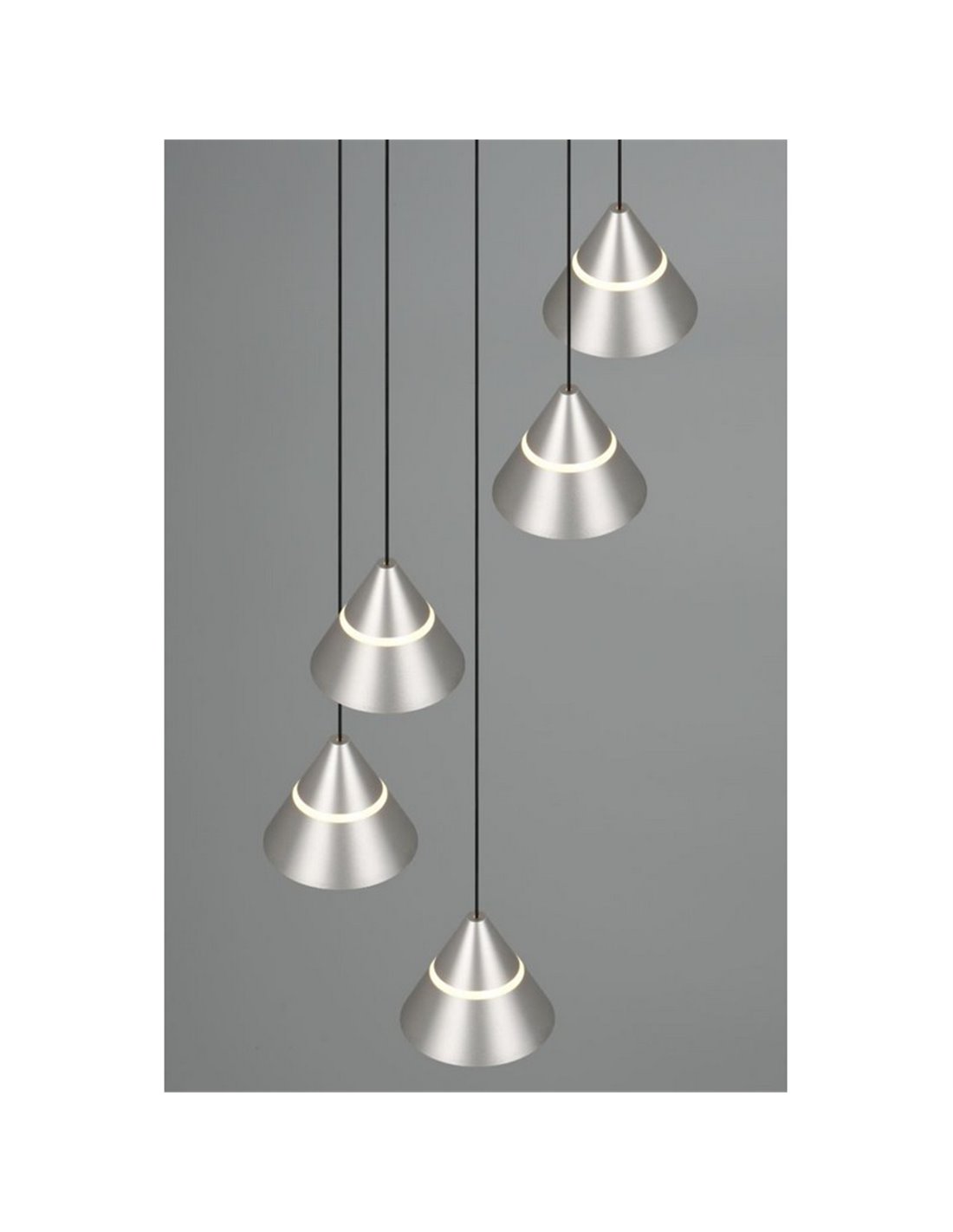LED-Hängeleuchte ROMEO mit 5 Leuchten in mattem Nickel-Finish. Leistung von 35W, 3500lm und höhenverstellbar. Ermöglicht die Auswahl der Lichtfarbe zwischen 2300K, 3000K und 4000K mittels DIP Switch. Schutzart IP20. Abmessungen: ↕ 200 cm | Ø 28 cm