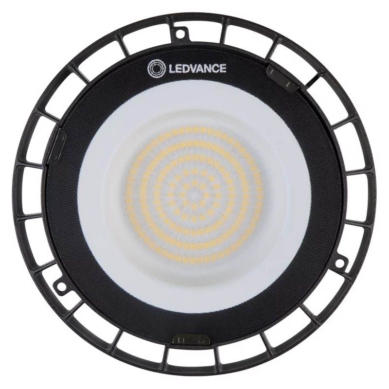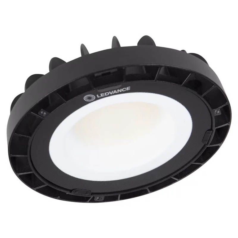 Industrielle LED-Haube mit einer Leistung von 83W, die 250W HID ersetzt, Modell High Bay Compact Value Class der Marke LedVance mit einer Garantie von 3 Jahren (Reihe mit gutem Preis-Leistungs-Verhältnis), erhältlich mit Lichtfarben 4000K und 6500K, und ihr Lichtstrahlwinkel beträgt 110º. Ihre Lichtleistung beträgt 10.000Lm und ihre Lichtausbeute ist 120lm/w.