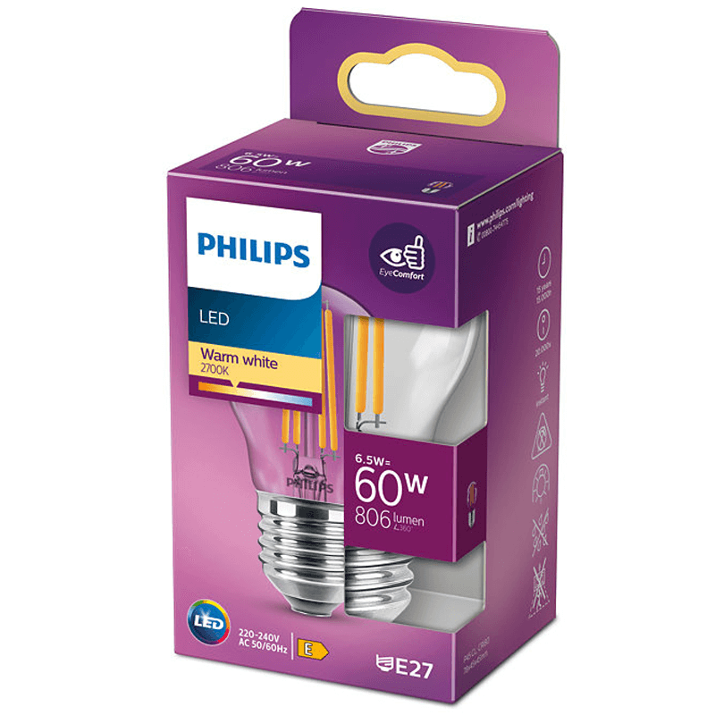 Die transparente LED-Lampe esferisch mit E27-Fassung und einer Leistung von 6,5W – 60W von Philips verbraucht etwa 85% weniger Energie als herkömmliche Lampen, dank der neuesten Energiespar-LED-Technologie. Diese Lampe ist nicht dimmbar und ist für die Verwendung in Innenräumen gedacht.