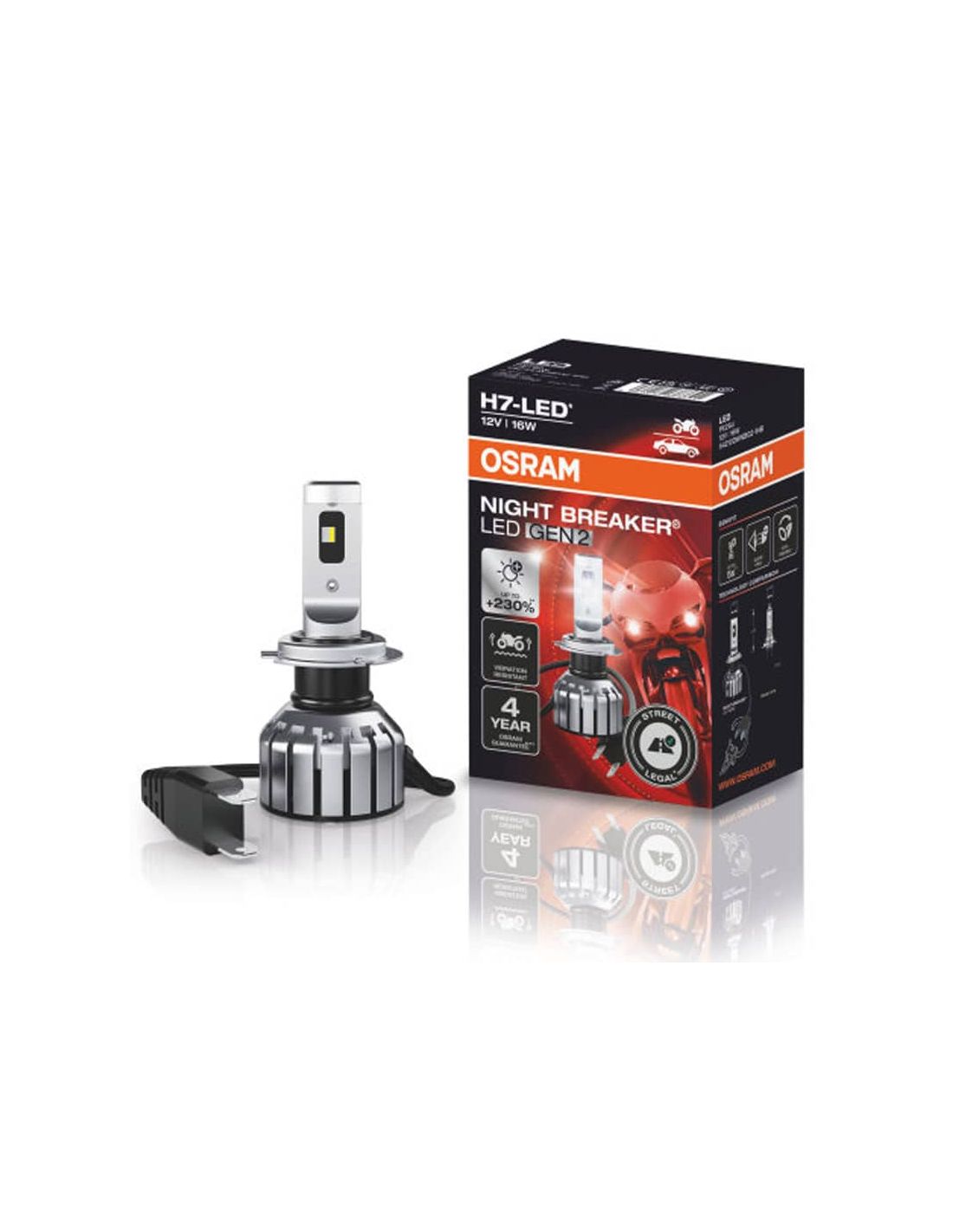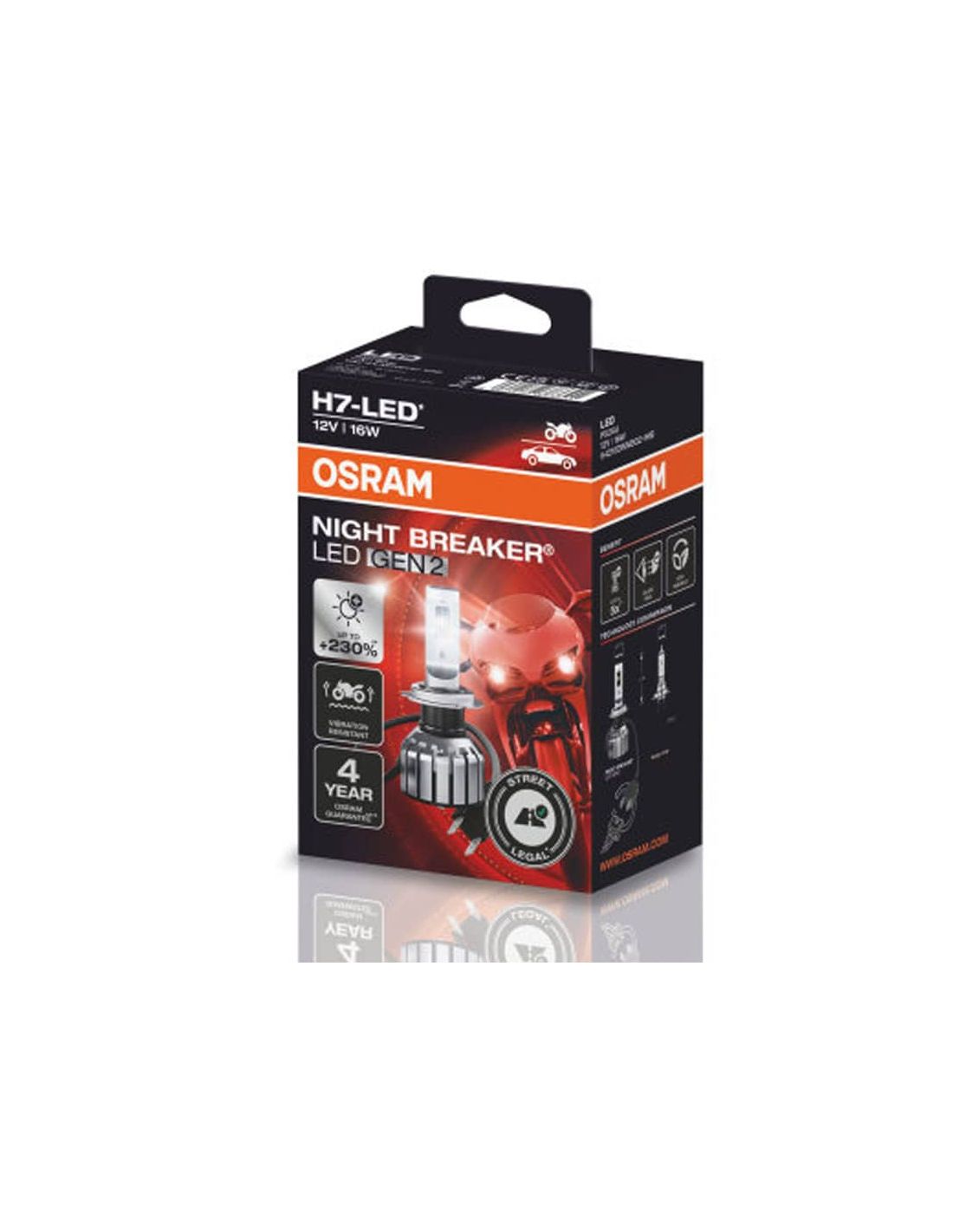 Entdecken Sie die b homologierte LED-Lampe H7 in Spanien mit der neuesten LED-Technologie von Osram. Es ist die neue Reihe von LED-Lampe H7 Osram Night Breaker Gen 2 für die Scheinwerfer von Motorrädern. Diese Lampe bietet 230% mehr Licht (verglichen mit dem Minimum ECE R112), eine Reihe von homologierten ECE-Lampen, (Legale Straßen).