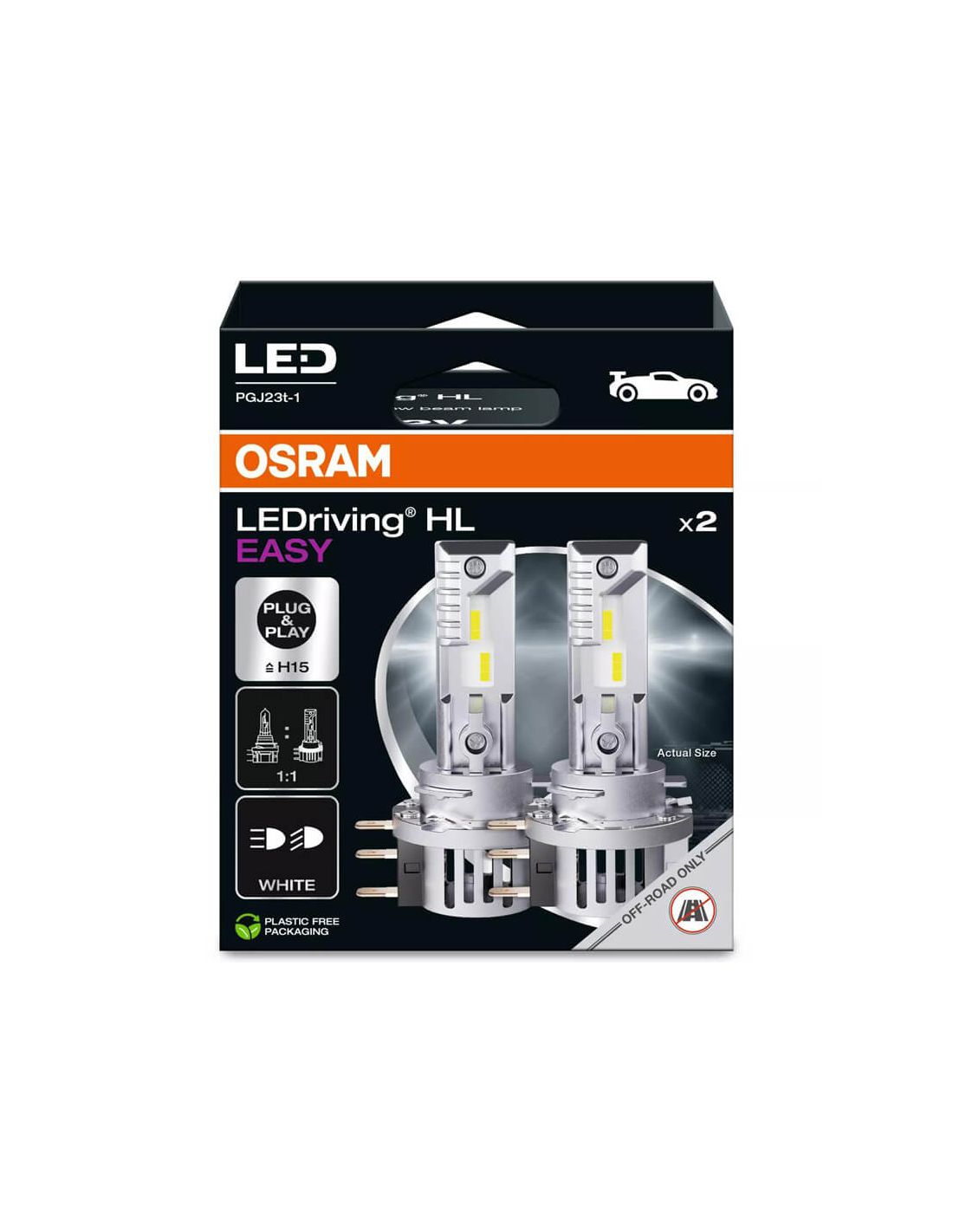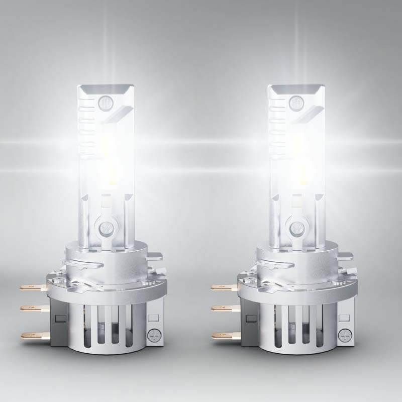 LED-Lampen H15 (PGJ23t) Osram HL EASY mit der Referenz 64176DWESY-2HB in einer Farbtemperatur von 6500K Kaltweiß mit einer Intensität von 1.250Lm / 250Lm und einer Leistungsaufnahme von 16W / 3W, sie ist heller als herkömmliche Halogenlampen, die Lampe ist für Abblendlicht, Fernlicht, Tagfahrlicht und Positionslicht geeignet, gültig für H15 ohne den Sockel zu wechseln. Neue Serie von Osram, keine Adapter oder Gummikappen erforderlich.