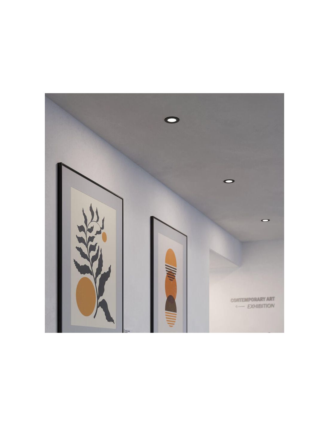 Diese Einbauleuchte bietet eine Leistung von 2,7W und eine Lichtstärke von 330 Lumen bei 4000K und 330 Lumen bei 3000K. Ihr Gehäuse aus mattschwarz lackiertem Stahl und der mattschwarze Lichtdiffusor sorgen für ein sauberes und elegantes Finish. Mit einem Durchmesser von 8,6 cm und einer Höhe von 2,6 cm passt sie sich leicht an jede Innen-Decke an.