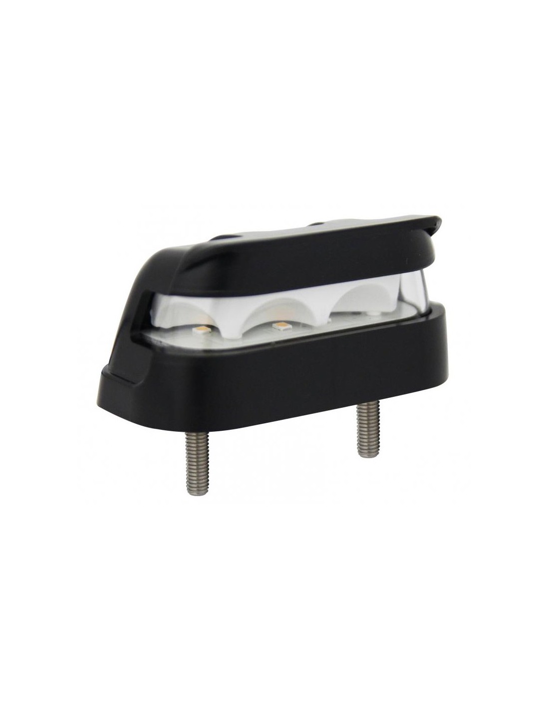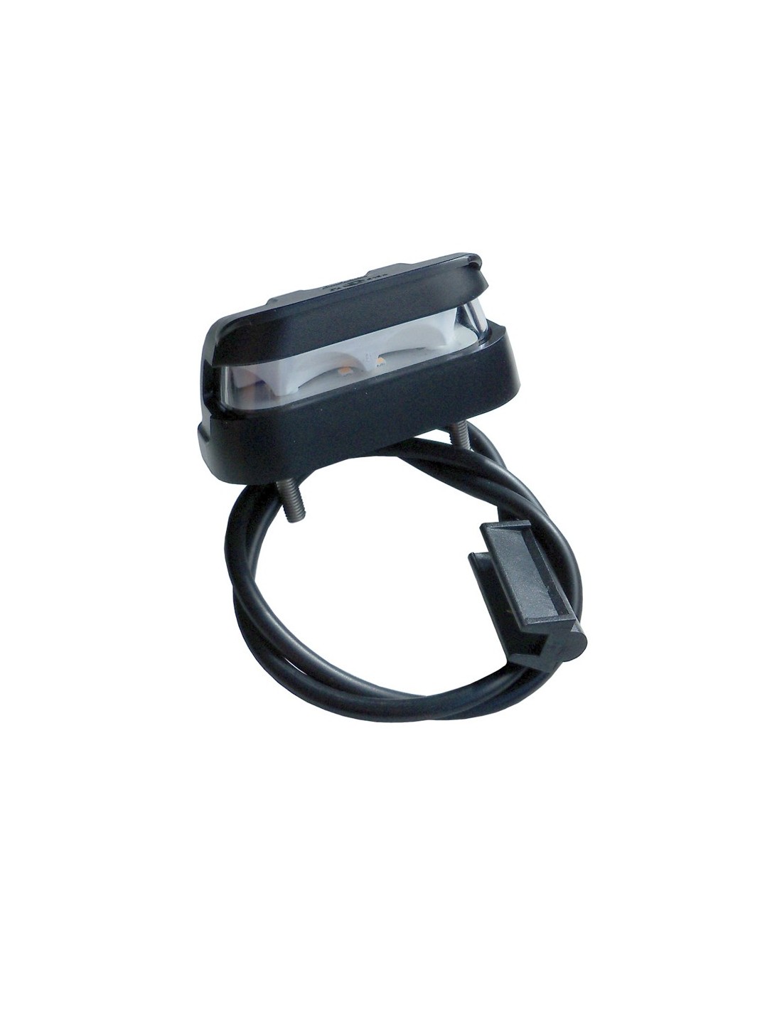 Homologierte LED-Nummernschildbeleuchtung, geeignet für 12-Volt- und 24-Volt-Systeme mit einem Schutzgrad gegen Wasser und Staub von IP67, umfasst 4 Hochleistungs-LEDs, einen halben Meter Kabel und einen Stecker für die Installation. Die Installation erfolgt ganz einfach mit den beiden mitgelieferten Schrauben, Muttern und Unterlegscheiben sowie der Klammer, um den Stecker am Stromkabel zu befestigen.