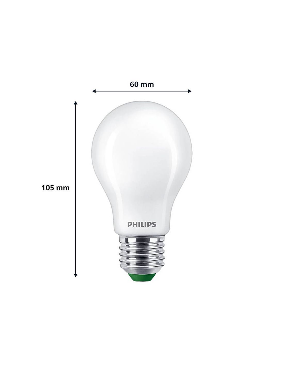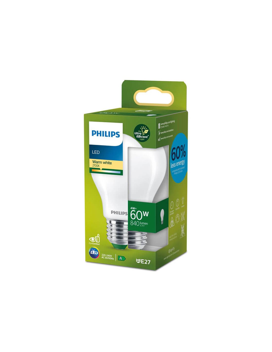Ultra effiziente A60 LED Glühbirne aus weißem Glas mit einer Leistung von 4W, die 60W einer herkömmlichen Glühbirne entspricht, mit einer Helligkeit von 840Lm. Sie hat eine Lebensdauer von 50.000 Stunden und 50.000 Ein- und Ausschaltzyklen, Philips bietet eine Garantie von 2 Jahren.
