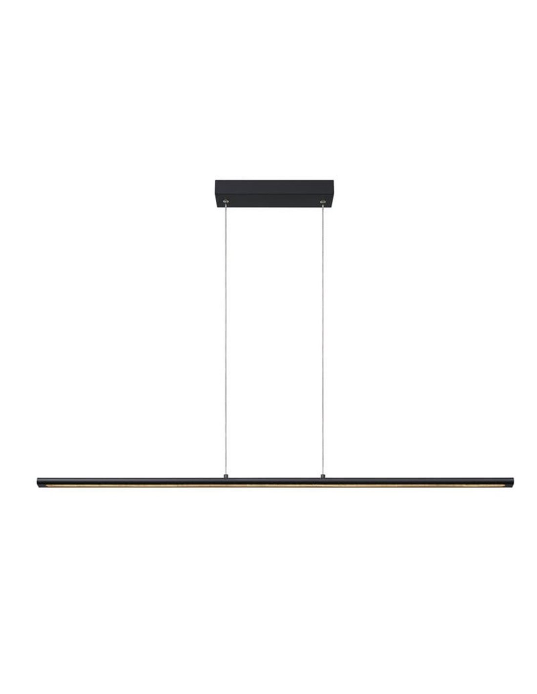 LED-Pendelleuchte LINEAL in Schwarz, mit modernem und minimalistischem Design. Die Lampe hat eine Länge von 122,20cm und eine Leistung von 38W, die warmes Licht von 3000K bietet, ideal für gemütliche Atmosphären.
