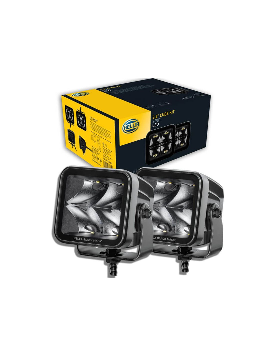 Pack mit 2 Einheiten LED-Quadratscheinwerfer von Hella Modell Black Magic Cube 3,2" Zoll, diese LED-Scheinwerfer haben eine Leistung von 3000Lm mit einem Verbrauch von 40W, funktionieren bei Spannungen von 10V bis 30V und die Optik ist für Langstrecken ausgelegt.