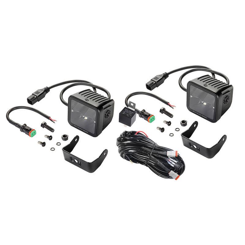 Die Black Magic Cube Scheinwerfer von HELLA sind 3,2", ihr Glas ist für Langstrecken ausgelegt. Ihr komplett schwarzes Design und die elegante Form lassen diese Leuchte hervorstechen. Die Black Magic Cube Scheinwerfer entsprechen der höchsten Staub- und Wasserdichtigkeitsklasse IP68/IP69K. Sie sind im Set mit 2 Stück erhältlich und beinhalten eine komplette Verkabelung mit DT-Stecker, Schalter, Steckdose und Relais, was die Installation erleichtert.