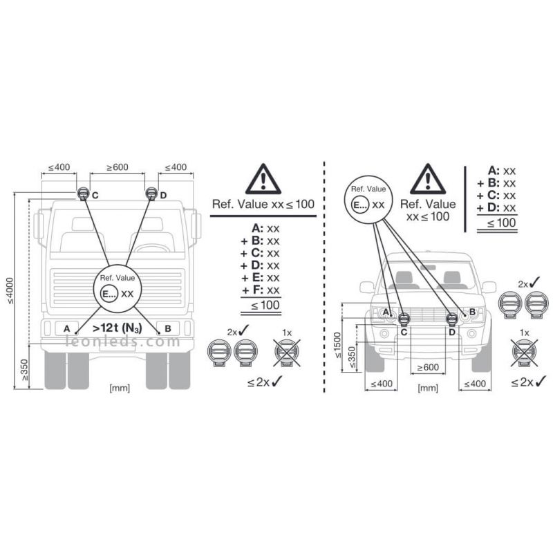 Er muss unter den folgenden Referenzmaßen installiert werden, und um ihn im öffentlichen Verkehr verwenden zu können, dürfen die Gesamtzahl der Hauptscheinwerfer und Fernscheinwerfer nicht mehr als 100 Lichtpunkte betragen, um ordnungsgemäß genehmigt zu werden. Sie können immer als Zierlich installiert werden, in diesem Fall darf es keine elektrische Installation geben.