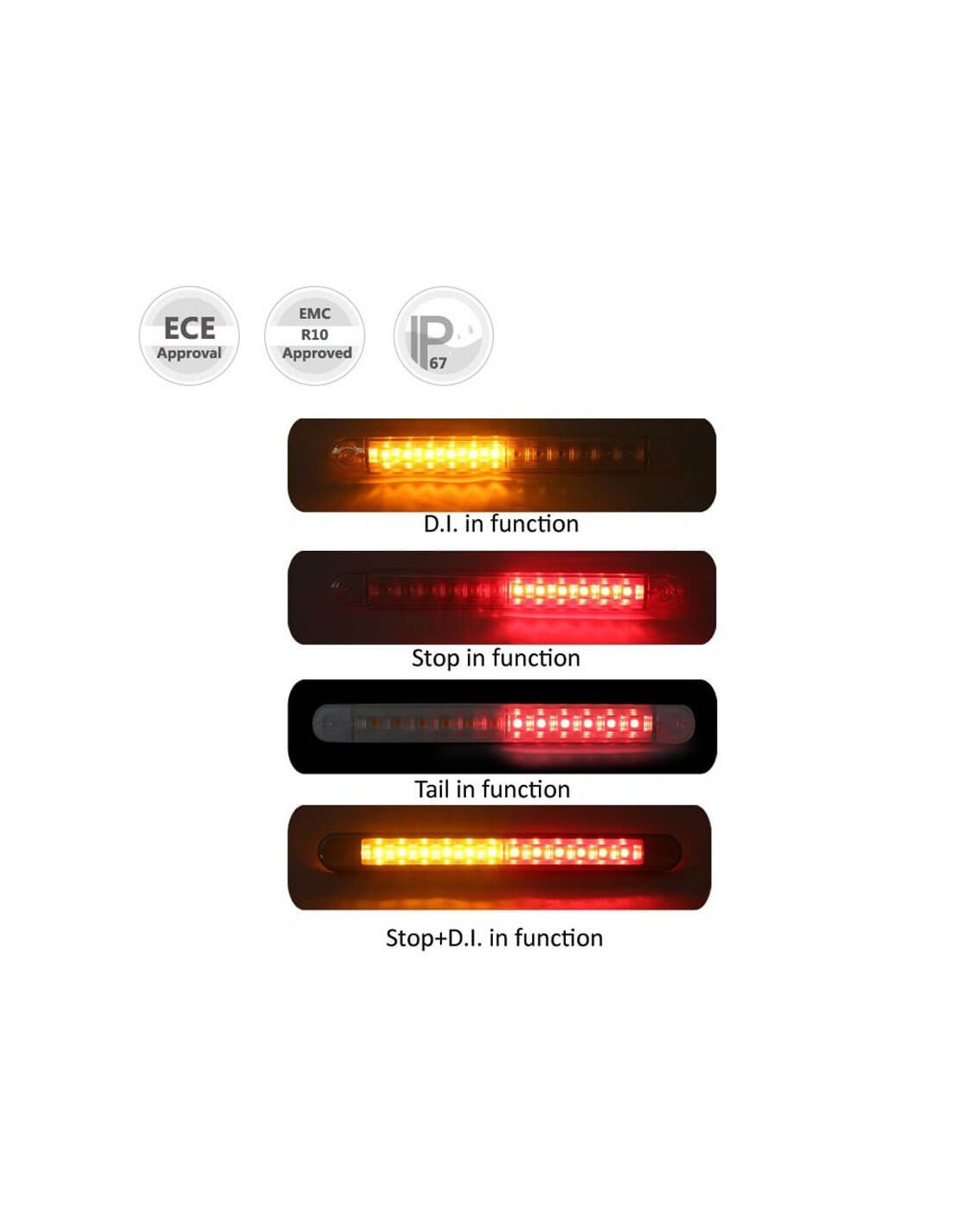 LED-Rückleuchte mit verchromtem Rahmen und 3 Funktionen, Blinker, Position und Bremslicht, kompatibel mit 12V und 24V Systemen. Ideal für Wohnmobile, Reisebusse und Busse. Einfache Installation in jeder Ausrichtung (horizontal oder vertikal) und an jeder Seite des Fahrzeugs. Enthält 19 cm Kabel. Wasserdicht und stabil, IP67 zugelassen.