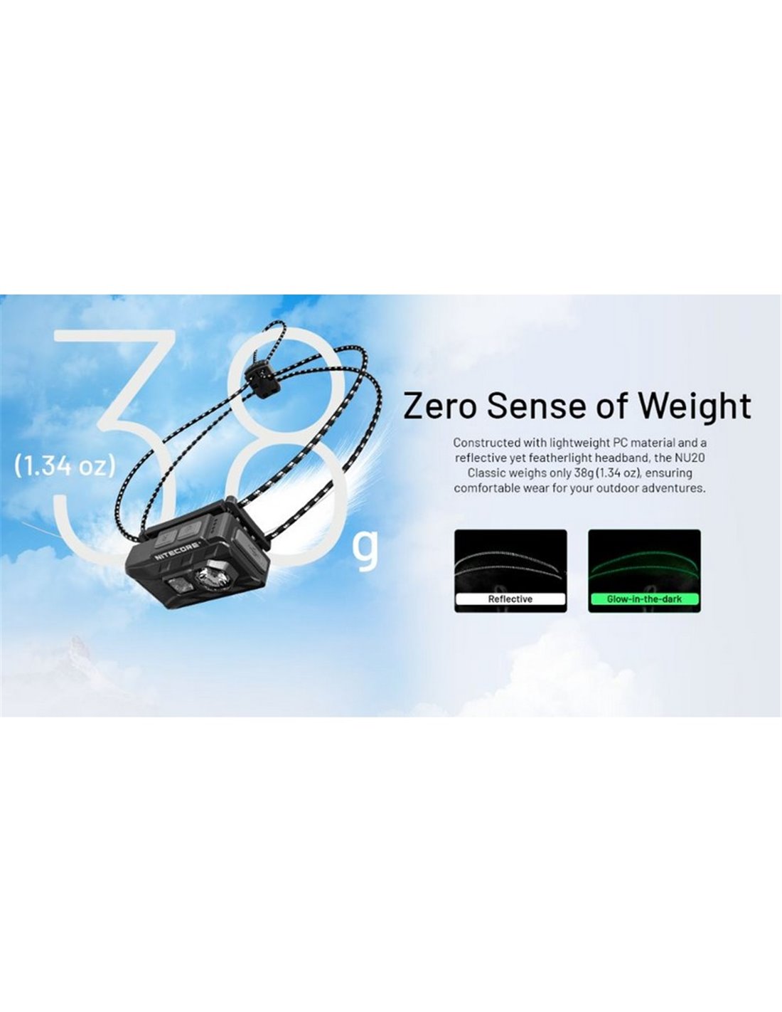 LED Stirnlampe NU20 Classic leicht und wiederaufladbar mit USB-C, maximaler Leistung von 360 Lumen und einer Reichweite von 109 Metern. Beinhaltet Modi für weißes Licht, rotes Licht und hohen CRI. Mit IP66-Zertifizierung und einem ultraleichten Design von 38 g, ist sie ideal für Trailrunning, Camping und Arbeiten im Freien.