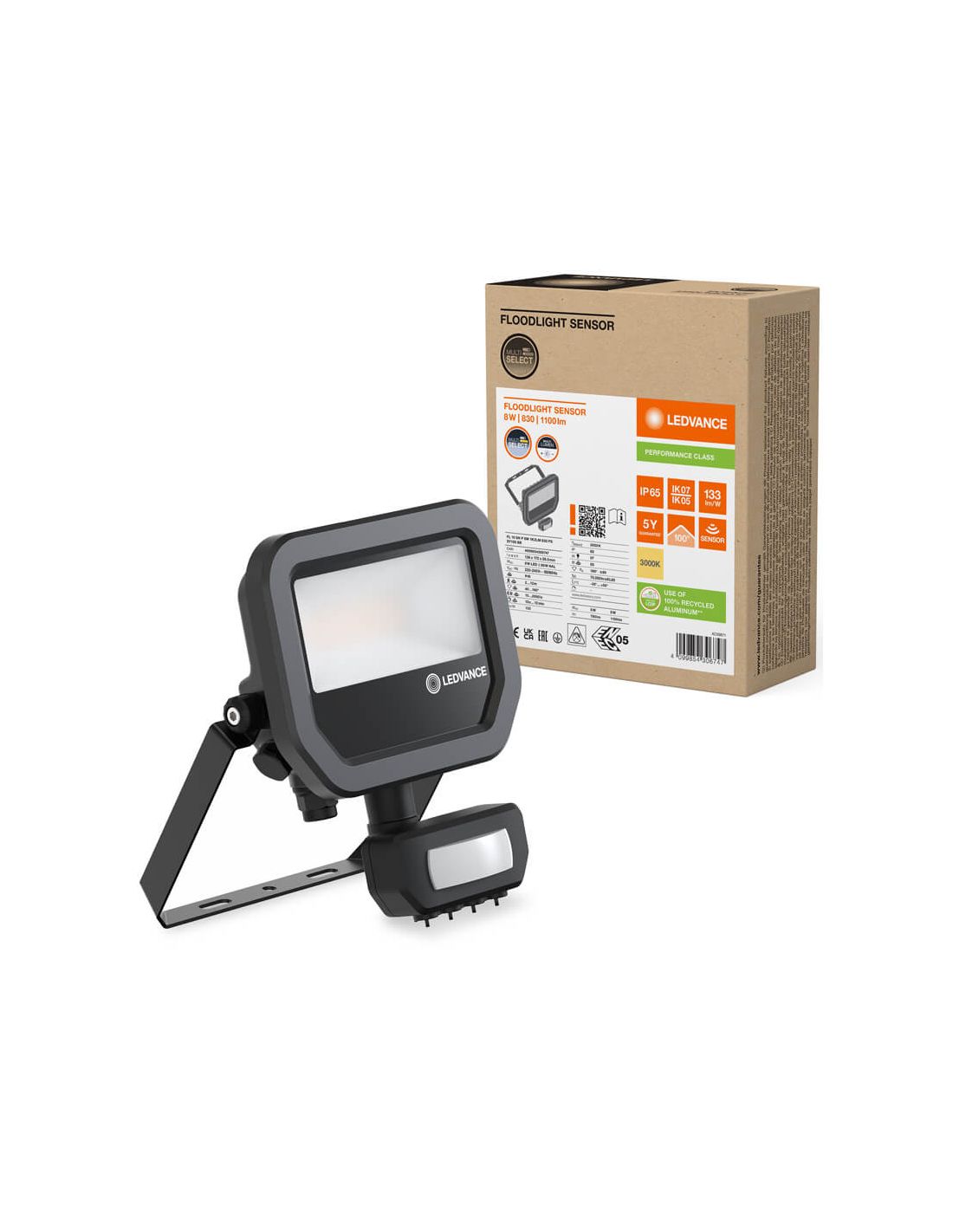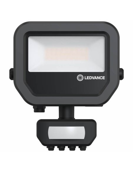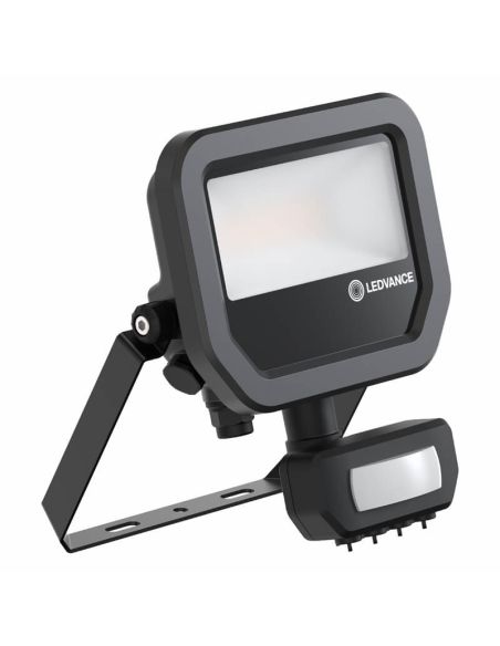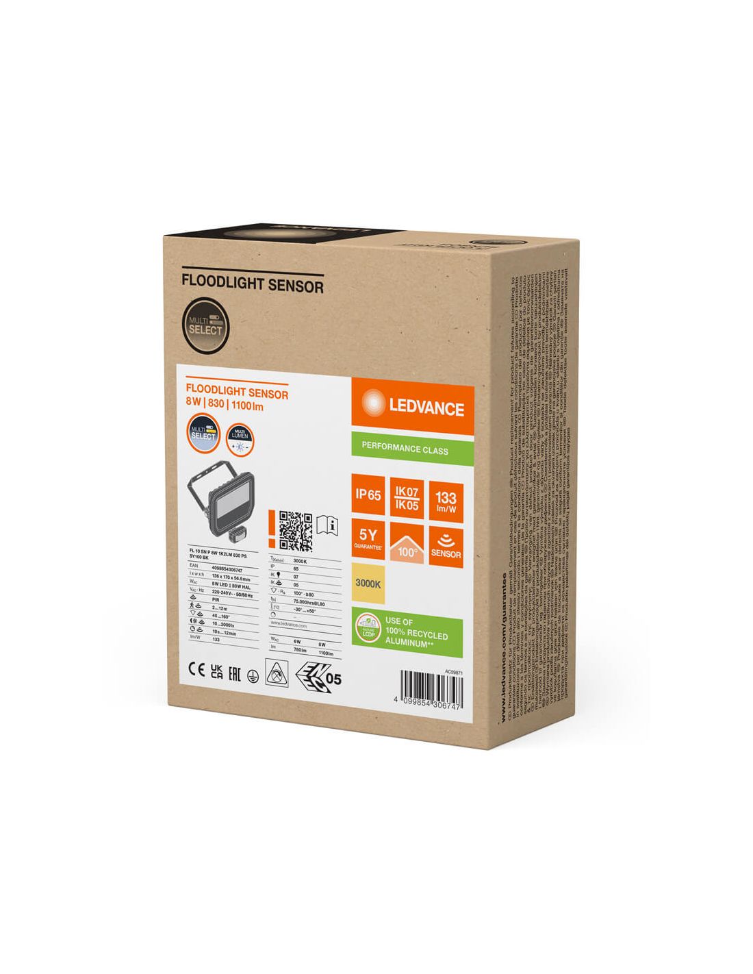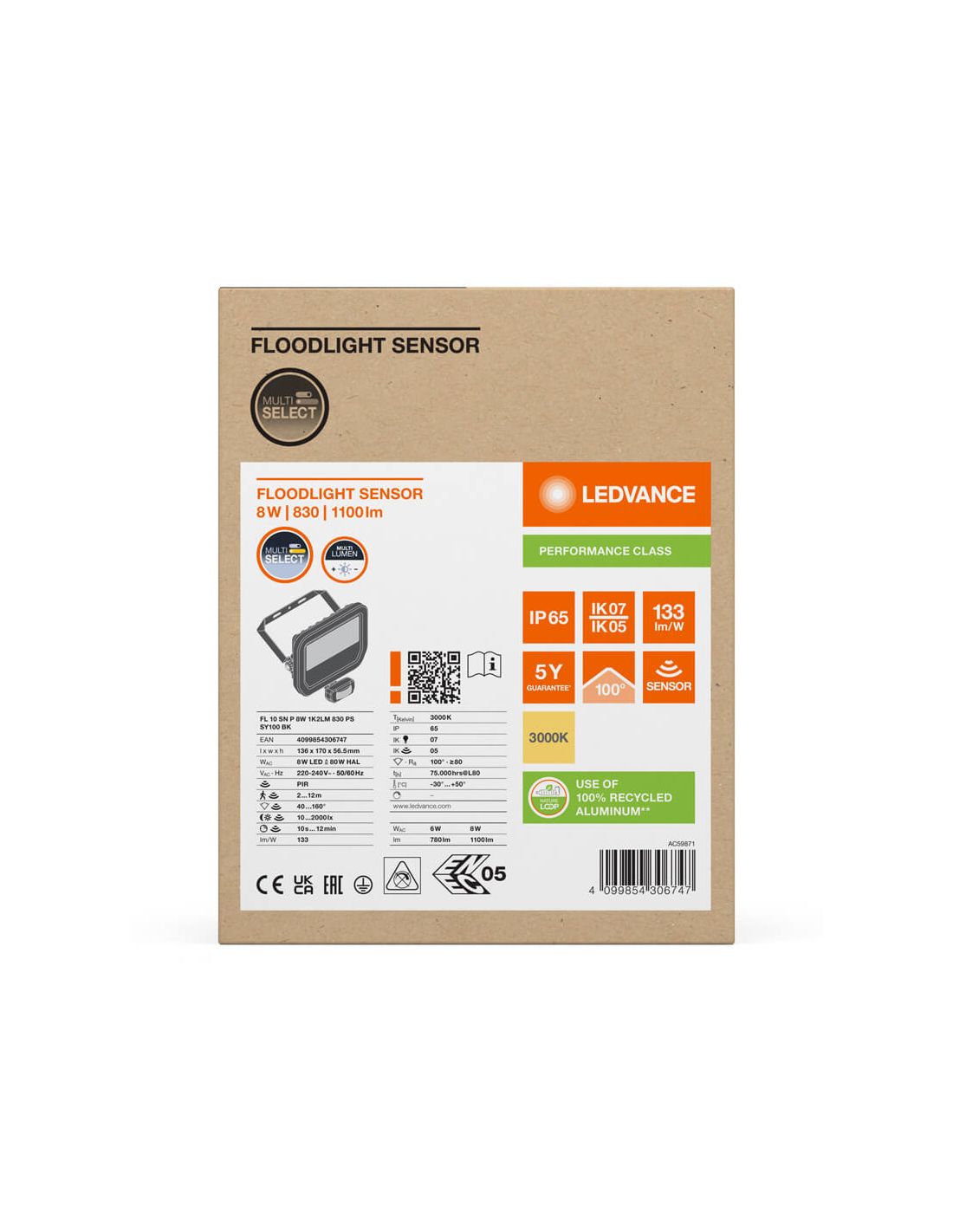 Schwarzer LED-Strahler mit 8W für den Außenbereich mit programmierbarem PIR-Sensor und weißem Licht, erhältlich in 3000K (warm) oder 4000K (neutral). Bietet 1100 Lumen und 780Lm mit Multi-Select, einem Abstrahlwinkel von 100° x 100° und ist aus langlebigen Materialien mit IP65-Schutz gefertigt. Ideal für Gärten, Fassaden und Parkplatzbereiche.