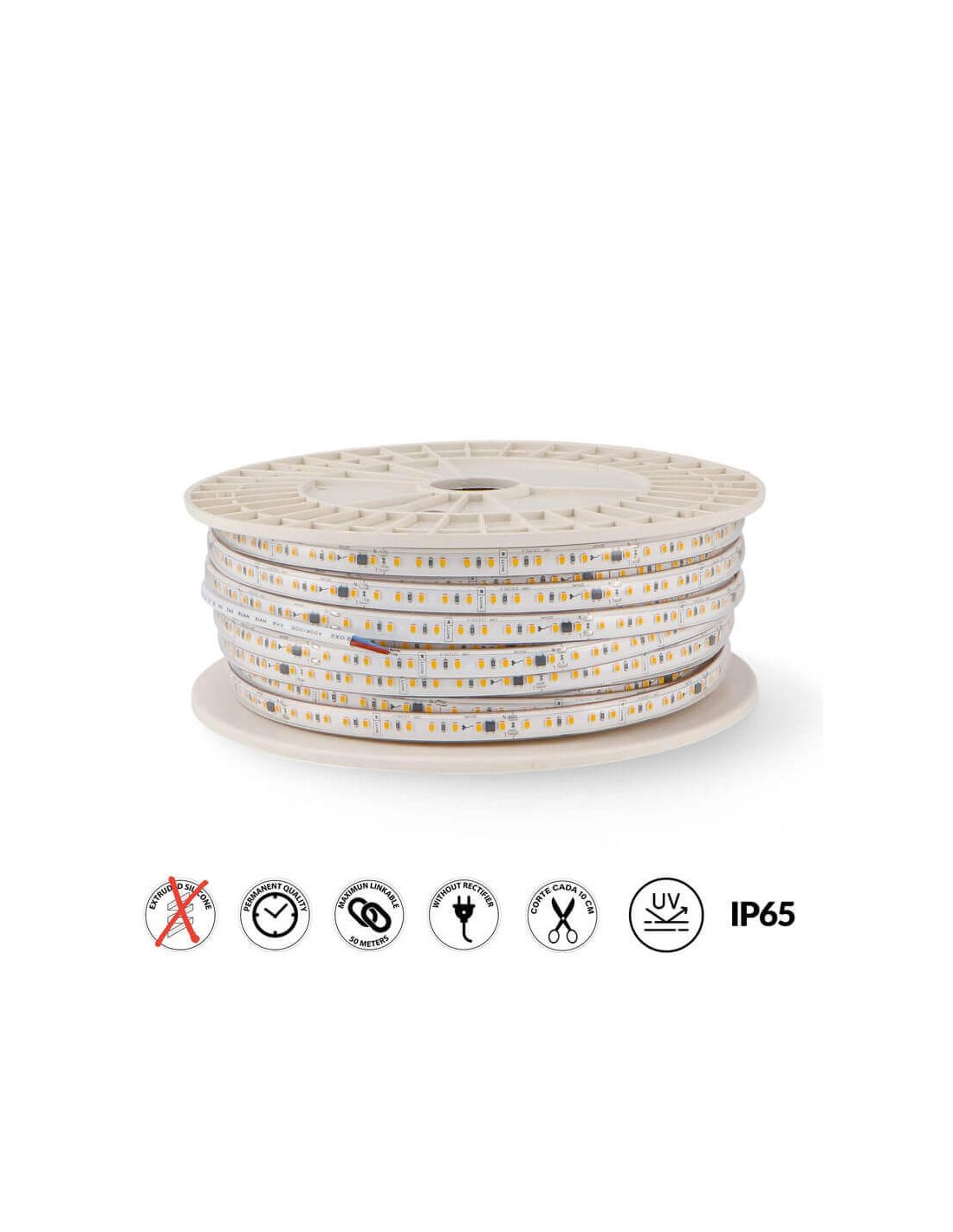LED-Streifen 220V von hoher Qualität, sehr leistungsstark, mit Schnitt alle 10 cm, mit einer Leistung von 17W pro Meter und 1500Lm pro Meter, erhältlich in 5 Lichttönen und geeignet für 220V AC-Installationen. Dieser hat eine Lebensdauer von bis zu 50.000 Stunden Nutzung. Der Preis beinhaltet die Rolle von 50 Metern und 1 Stromkabel ohne Gleichrichter, der einzige 220V LED-Streifen, der nur das Kabel und den Steckeranschluss hat, beinhaltet 3M Kleber und kann problemlos in ein Aluminiumprofil installiert werden.