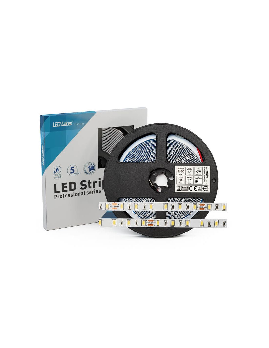LED-Streifen mit 5630 Chips, eine Leistung von 18W/m mit 60 LEDs pro Meter, ideal für die Installation im Innenbereich mit einer Spannung von 24V, sein Schutzgrad ist IP65 (Außenanwendung), die Lichtleistung beträgt 1.620 Lumen pro Meter mit einer Effizienz von 103Lm pro Watt Verbrauch.