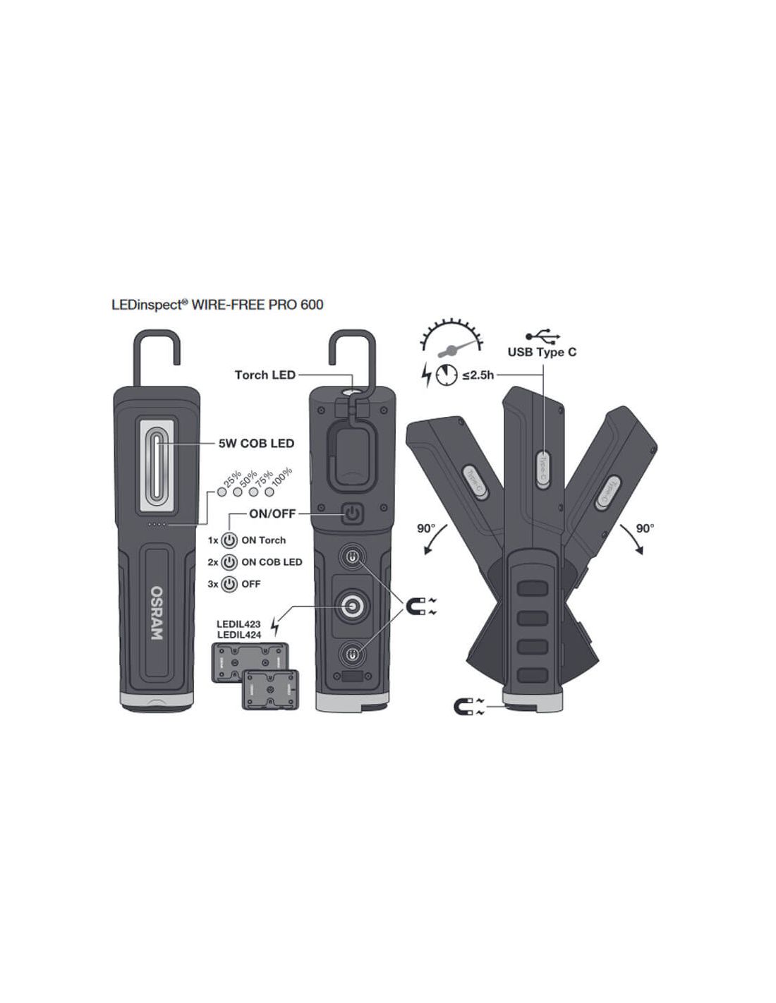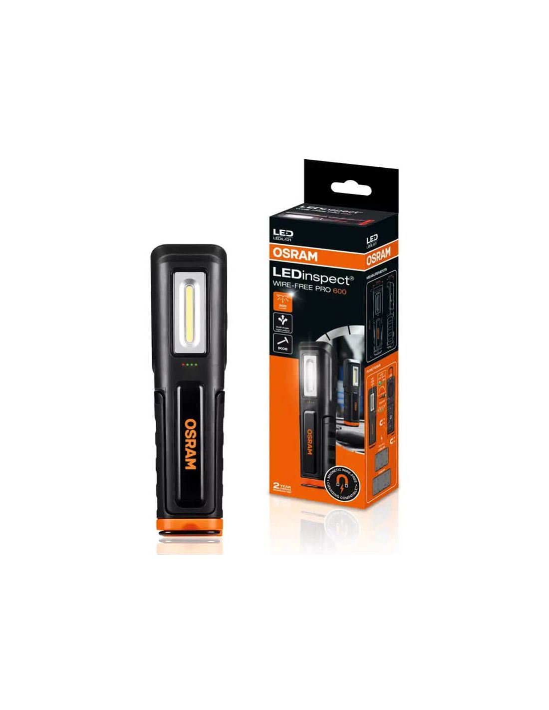 Die LEDinspect WIRE-FREE PRO 600 von OSRAM ist eine tragbare und effiziente Beleuchtungslösung für Fachleute, die Komfort und Leistung suchen. Mit einem innovativen Design lässt sich diese Inspektionslampe einfach kabellos aufladen, wenn sie auf ihrem magnetischen Ladegerät platziert wird, was die Notwendigkeit, eine Steckdose anzuschließen, beseitigt und es ermöglicht, ohne Unterbrechungen zu arbeiten.