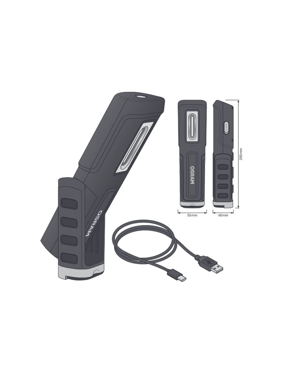 Diese Lampe liefert einen Lichtstrom von 600 Lumen und ein klares weißes Licht von 5700 K, ideal für detaillierte Inspektionen in Werkstätten, Garagen und anderen professionellen Umgebungen. Ihre kompakte Größe (L 205 mm, B 55 mm, H 45 mm) und das leichte Gewicht (300 g) sorgen für einen einfachen Transport und Anpassung an jeden Arbeitsplatz.