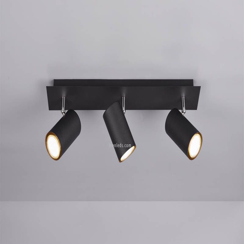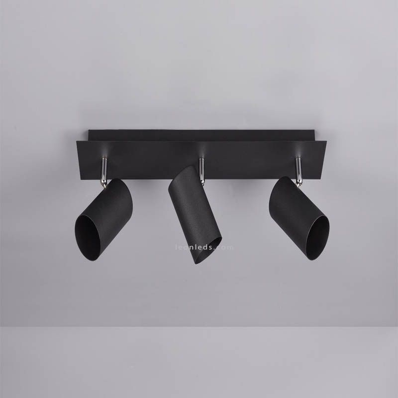 Leiste mit 3 schwenkbaren Strahlern zur Installation an der Innendecke in Schwarz der Serie Marley von Trio Lighting. Sie verfügt über eine Metallstruktur und 3 zentrale Strahler, die sich um 330º drehen lassen.