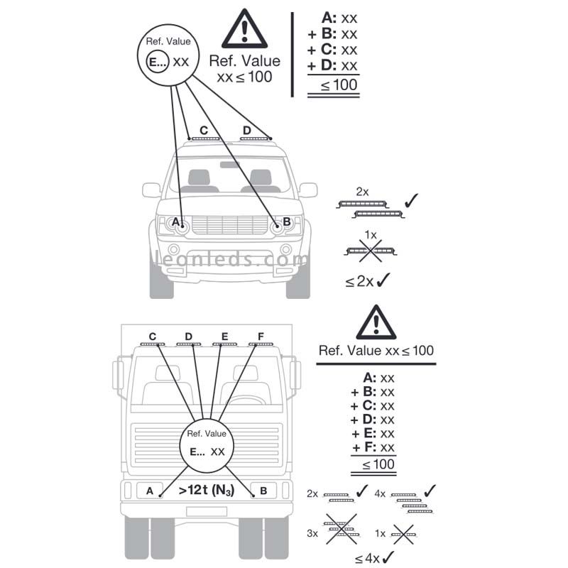 Diese LED-Leiste hat die Genehmigung, in jedem Fahrzeug installiert zu werden, immer paarweise; sie kann nicht einzeln installiert werden; für das Fernlicht beträgt die Genehmigung ECE R112 mit 30 Lichtpunkten. Sie hat auch einen Schutzgrad gegen Wasser und Staub von IP67 und eine elektromagnetische Verträglichkeitsregelung EMC/EMI R10.