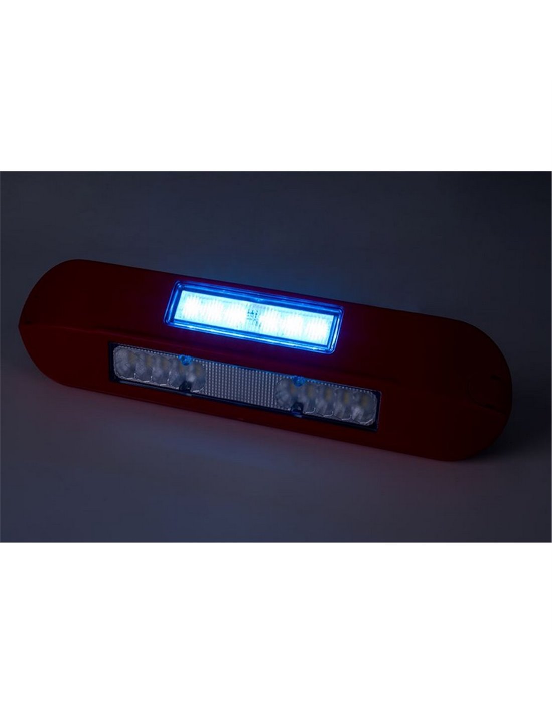 LED-Arbeitsscheinwerfer LRD 3043/R/B2/4K mit blauer Blitzwarnung (2 Stufen Tag/Nacht). Ausgestattet mit 20 LEDs 4000 K für Beleuchtung und 6 LEDs für Signalisation. Funktioniert bei 12/24 V, bietet 1000 lm, erfüllt IP68, EMC und Zulassung R65 XB2. Rotes Gehäuse.
