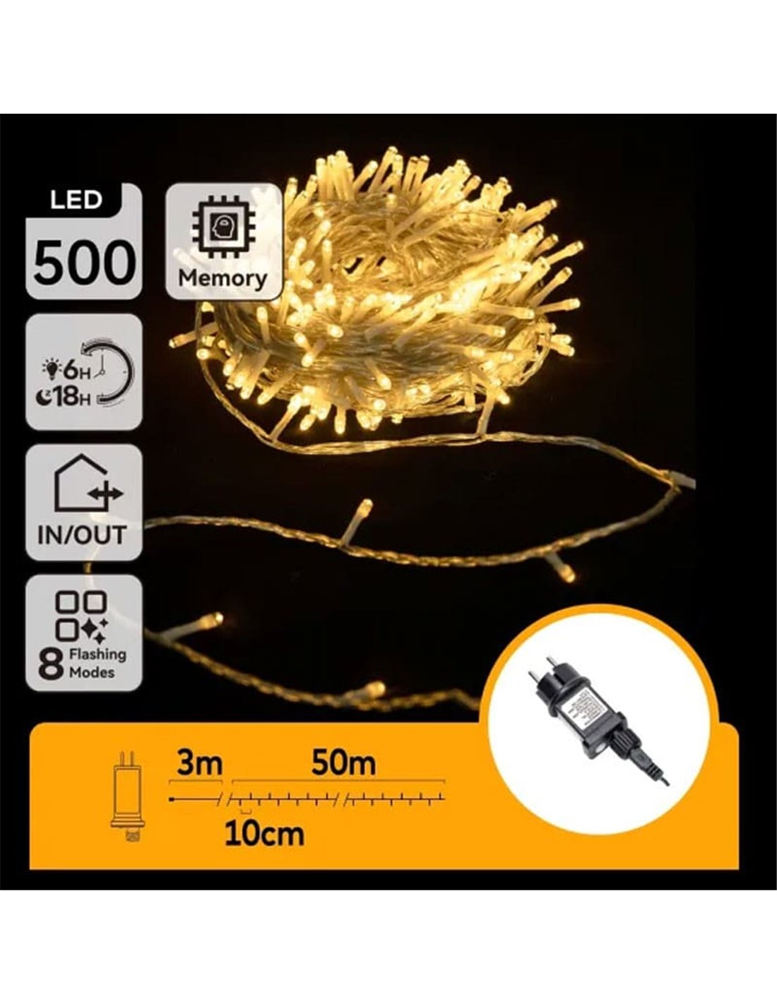 - 50 m beleuchtet mit 500 LEDs und 10 cm Abstand zwischen den Lichtpunkten für einen kontinuierlichen und sanften Effekt.