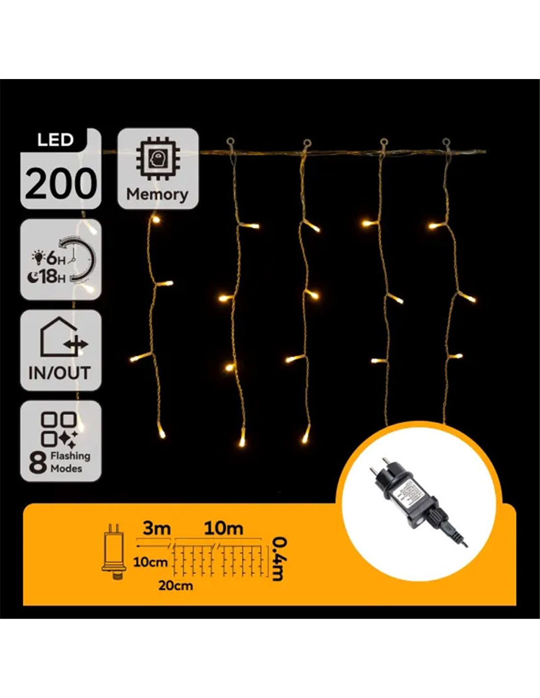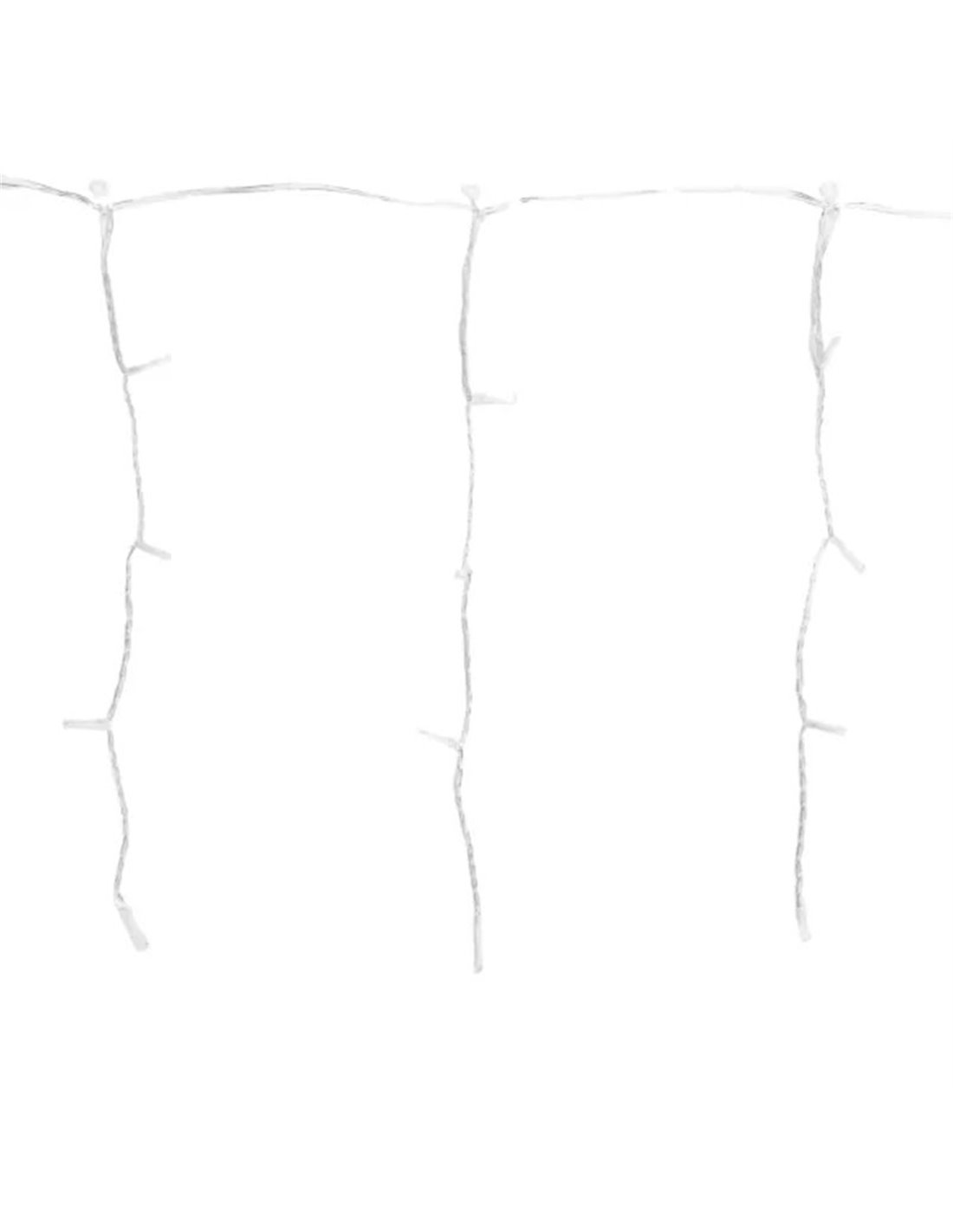 Sie funktioniert mit Niederspannung über einen Transformator, bietet 8 Beleuchtungsmodi mit Speicher und Timer und hat Schutz IP44, sodass diese Niederspannungs-LED-Eiszapfen-Lichterkette für Innen- und Außenbereiche sicher ist, einen geringen Stromverbrauch (≈3,6 W) hat und ideal für viele Stunden während der gesamten Weihnachtskampagne genutzt werden kann.